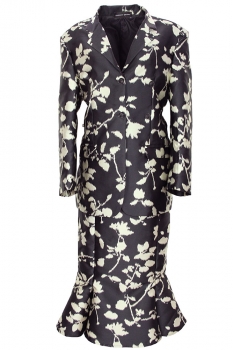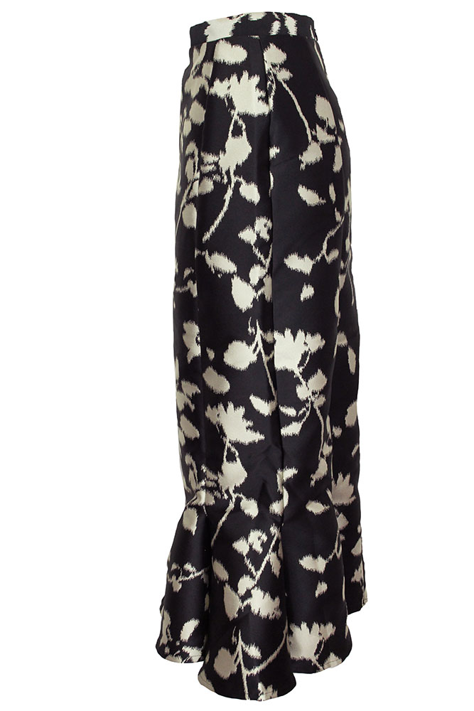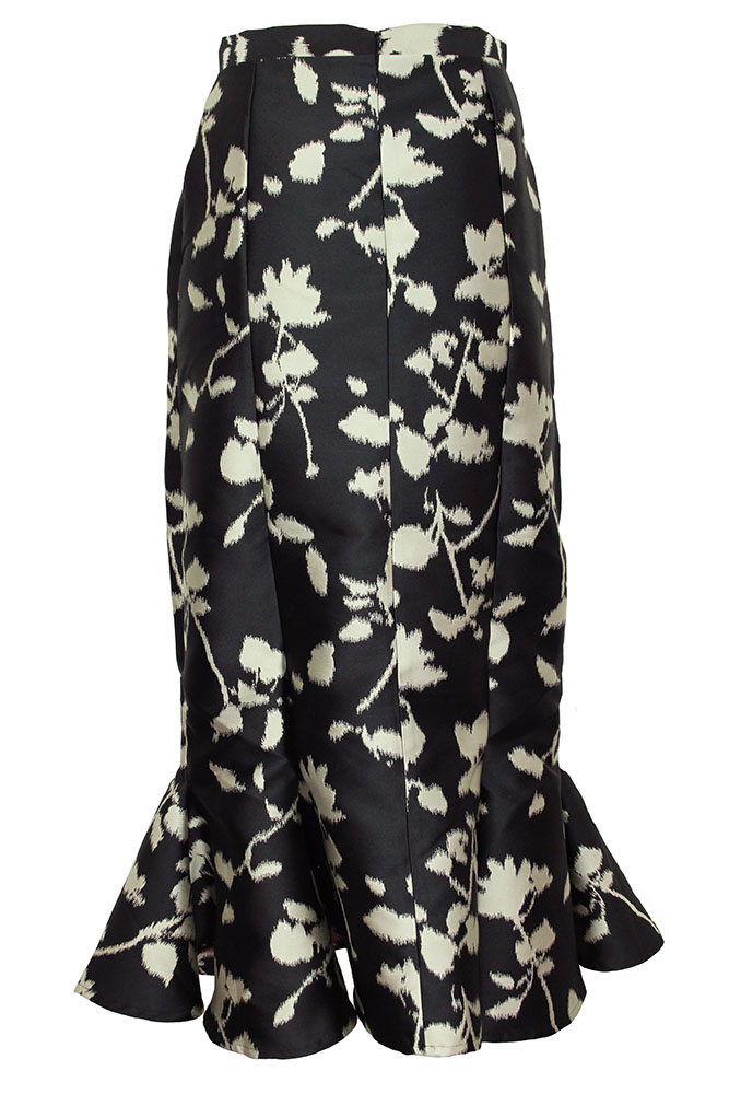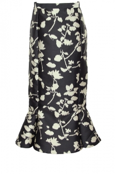 Barbara Bologna ankle length, high waisted, shaped, fish tail skirt in black fabric with woven floral design. Rear zip fastening. Panel construction. A beautiful full fish tail at hem. Fully lined down to where the fish tail starts. It says hit is a large, but more a medium size. Matches the jacket in the same fabric creating a stunning outfit.
