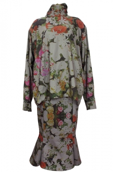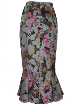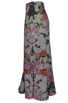 Barbara Bologna ankle length, high waisted, shaped, fish tail skirt in multi-coloured, floral print, stretch fabric. Rear zip fastening in a deep red colour. Panel construction. A beautiful full fish tail at hem. Fully lined in white down to where the fish tail starts. It says is a large, but more a medium size. Matches the shirt in the similar fabric creating a stunning outfit.