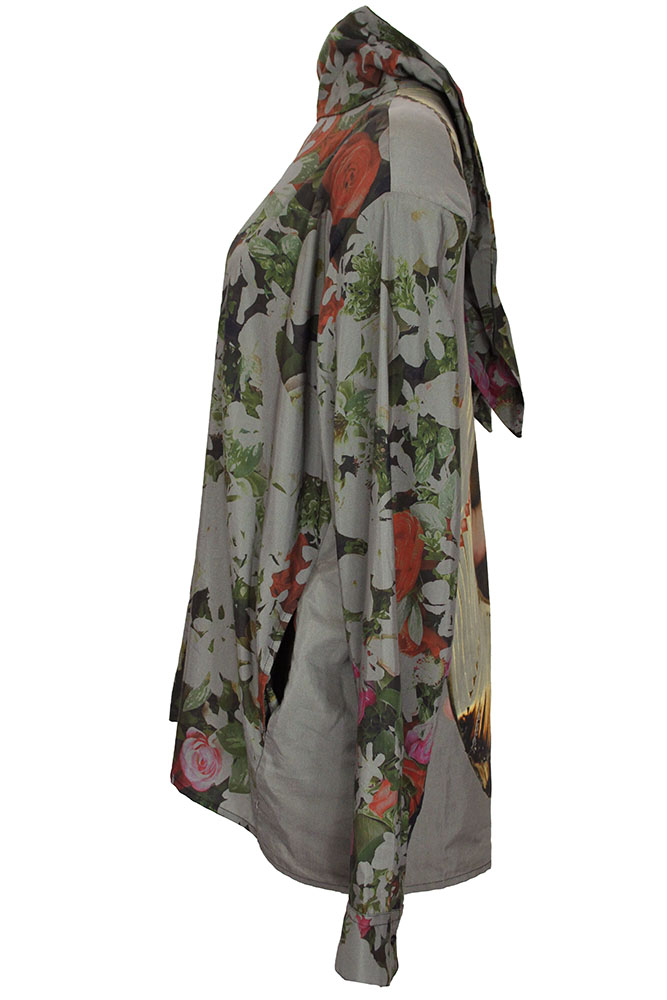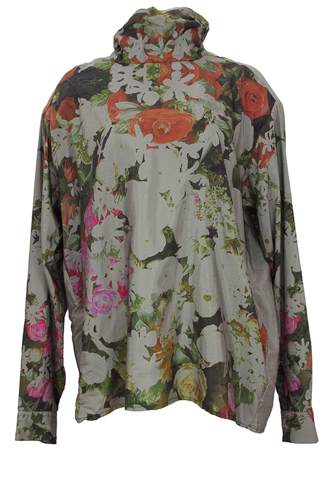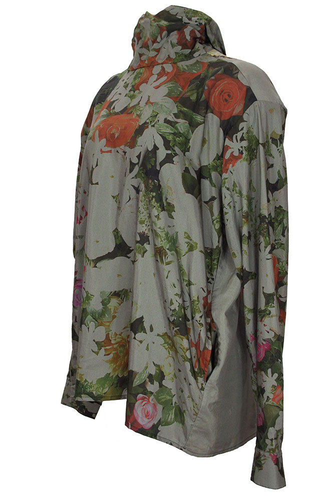 Barbara Bologna Over-sized, one-size, long, padded power shouldered, long sleeved top in multi-coloured, floral print fabric. High, soft collar with fabric ties at the rear. Short opening at rear collar with white pearl and sparkling button fastening. Single button, classic shirt cuffs. Slightly longer at the rear. A wonderful top that matches the fish tail skirt in similar print.