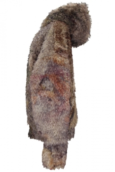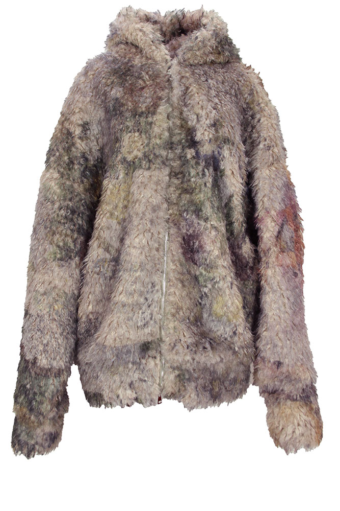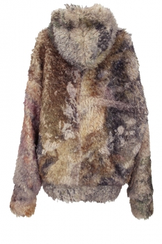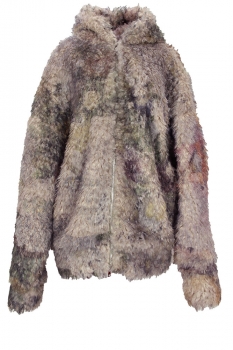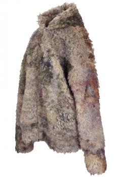 Barbara Bologna One-size, oversized, faux-fur, zip fastening hooded coat in beautiful, soft random dyed colours. Hood lined with faux-fur. Double zip fastening down the front. Wide and generous sleeves. Wide bodied to give a wonderful drape. Fully lined in light grey colour. Generous turn ups at cuffs and hem. A really beautiful piece of clothing
