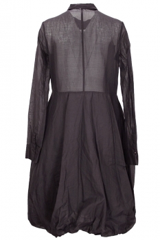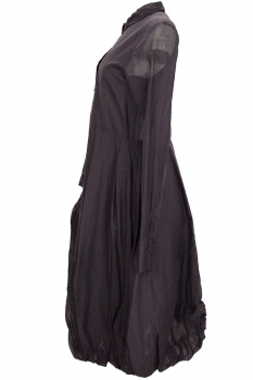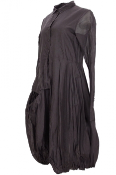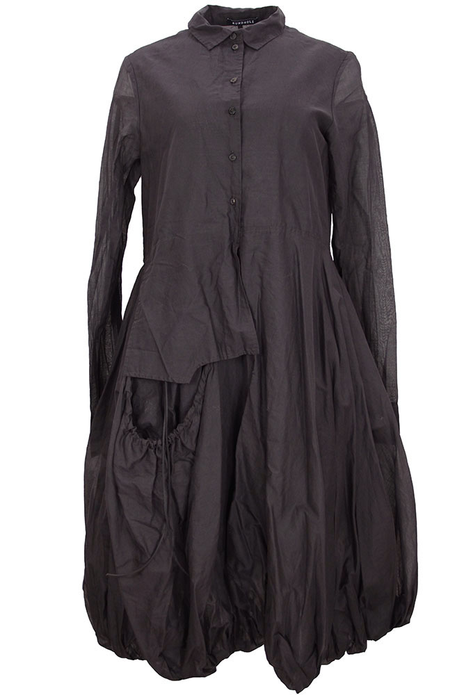 Rundholz Mainline Collection Long sleeved, midi dress in 100% crisp cotton, Turf Paper colour (an off-black with other tones) Small collar. 6 button fastening on upper section. The right side top panel is designed to sit like a blouse over the skirt section, while the left is connected directly to the skirt section. Single button, shirt style cuffs. The skirt section is very full and double layered, with 2 side pockets. On the right side of the skirt there is a very full, open-mouth style pocket with leather drawstring and leather locks, to close the pocket opening. The hem turns up into the inside, creating the inner layer, Beautifully ruched and gathered. The Upper section id quite sheer, whilst the skirt section is opaque. A beautiful dress with lots of beautiful design.