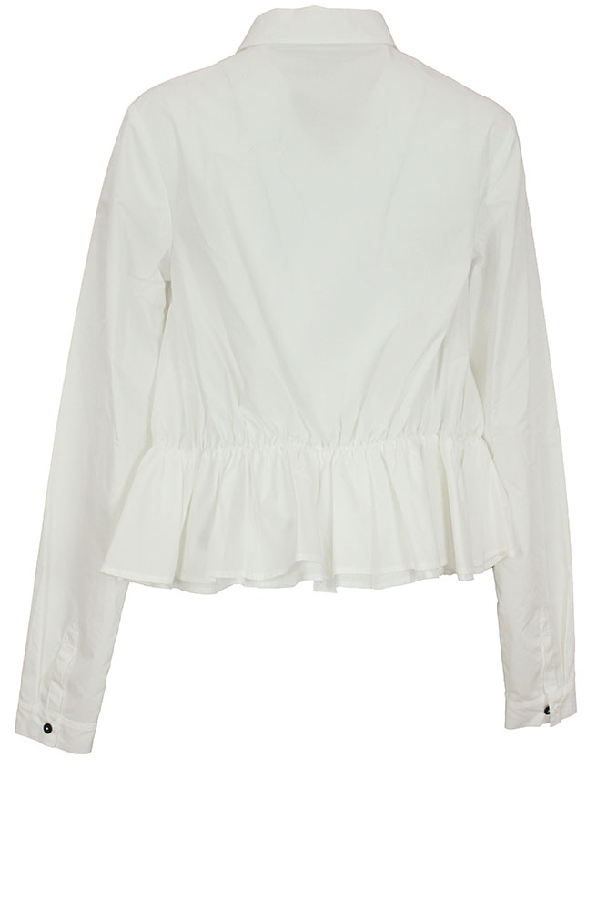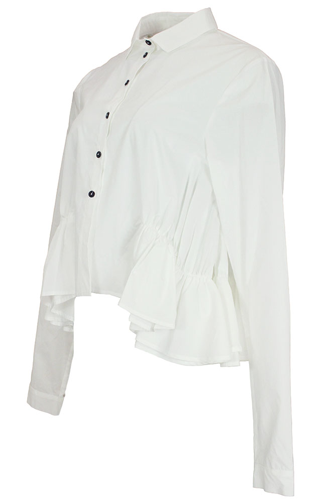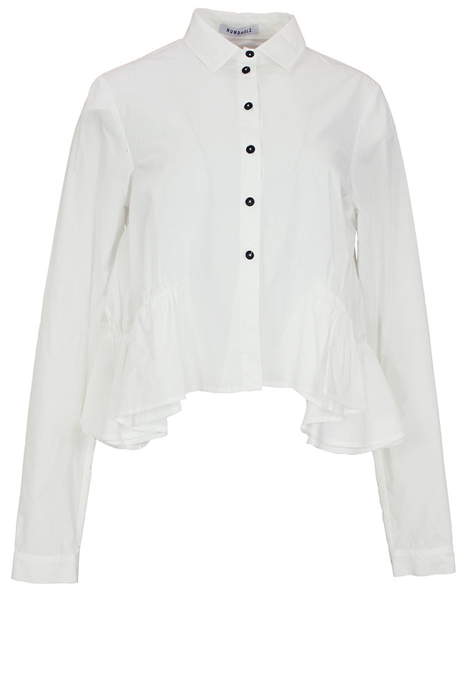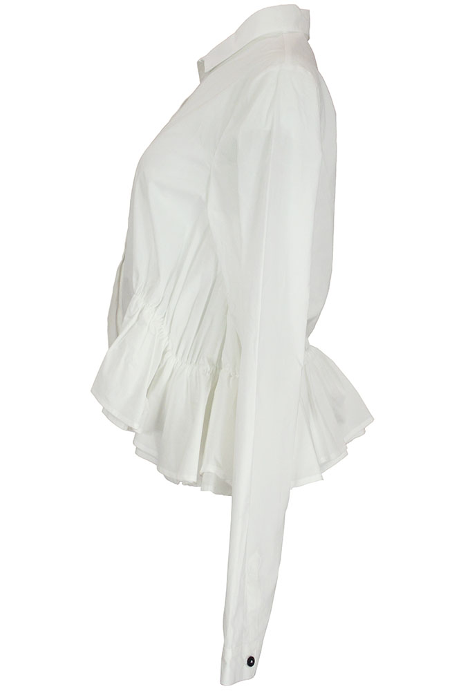 Rundholz Mainline Collection short, ruched peplum shirt in ghost white cotton. Small collar. 6 button fastening down the front. Very wide at hem with double layered, ruched peplum giving a wonderful full look. Single button, classic shirt cuffs.