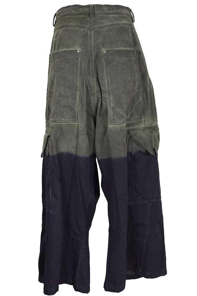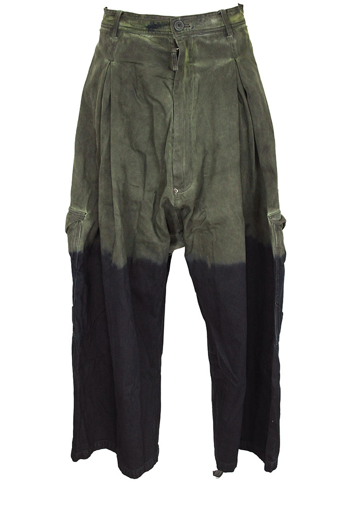 Rundholz Dip Collection over-dyed, low drop-crotch, very wide legged, cargo style, pleated trousers in pine medium colour way. Waistband with belt loops and single button fastening, with internal button reinforcer. long zip fly with covering placket and fabric pull. Box pleated on each leg. 2 side pockets with rivet reinforcing. 2 rear patch pockets, with finishing trim and rivet reinforcing and triangular insets at each lower corner. 2 rear side pockets, with triangular folded flap and button fastening, triangular insets open on the inside at each corner. Finished hems.