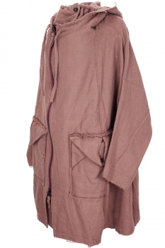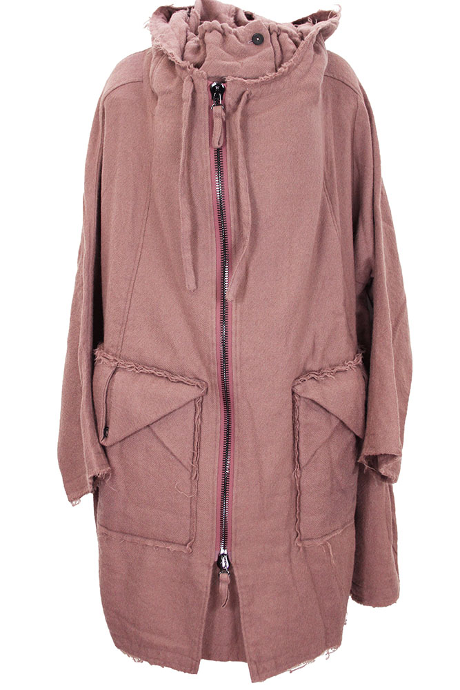 Rundholz Dip Collection wide and long hooded, wool coat with zip and button fastening in Light Flamingo colour. Hood with double layered panel and drawstring and raw edged finish. There are 2 panels at the front (2 layers), the inner layer has 11 button fastening and the outer panel a long double zip fastening, with fabric pull. The inner panels has an elasticated neckline with drawstrings and metal locks. 2 extra large patch pockets with triangular, folded fabric flaps and button fastening. Raw edging throughout. The cuffs have a double layered raw edged panel. The hems are double layered panels also with raw edged finish. all buttons have inner reinforcing buttons. A stunning coat. Although sized small it will fit a few different sizes as the garment is wide and the sleeves very generous.