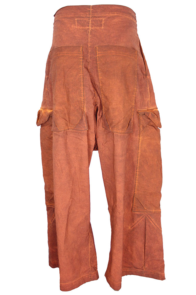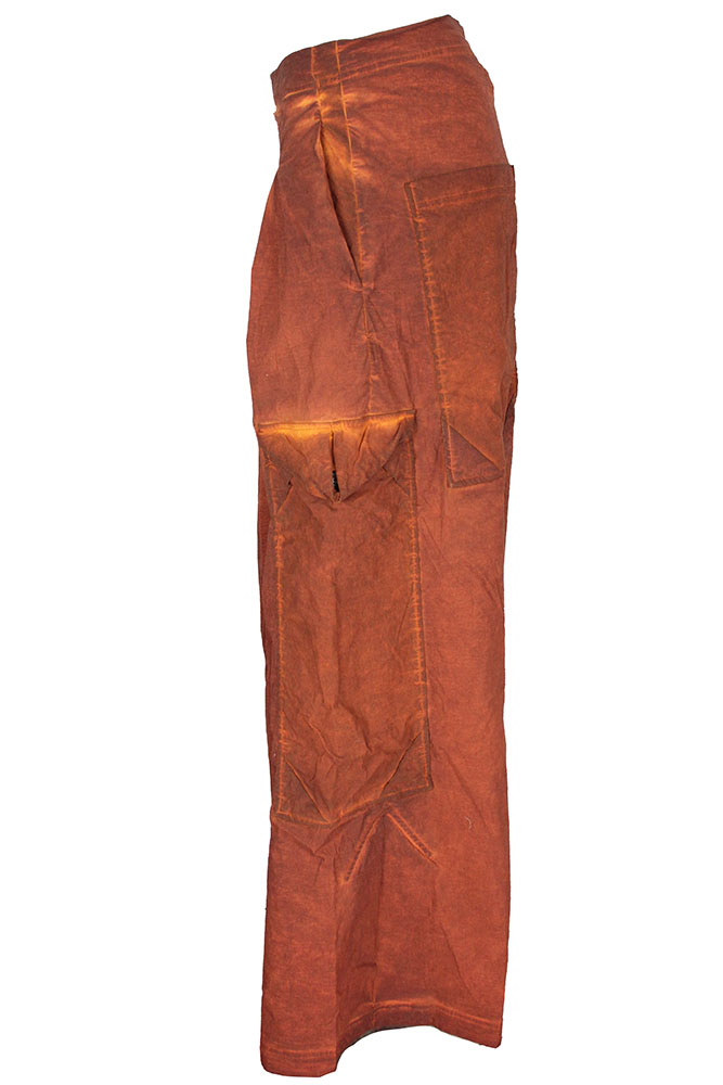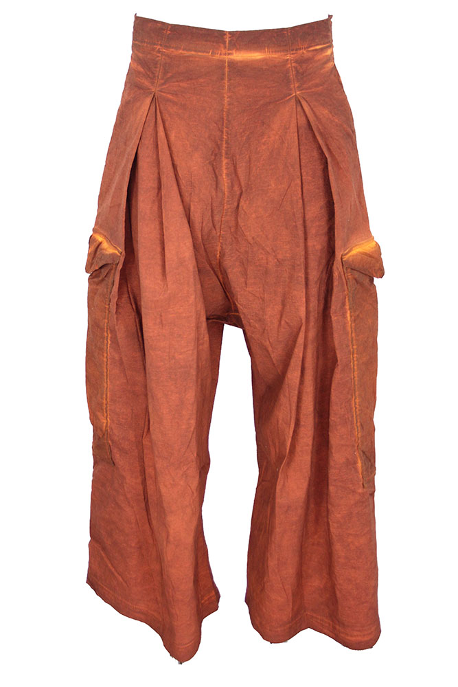 Rundholz Dip Collection stretch fabric, distressed, over-dyed, very wide legged, low drop crotch trousers. Pull-on style. Box pleated on front panels. 2 side pockets and 2 large patch pockets on side, lower thigh, with triangular folded fabric flap and button fastening. 2 large patch pockets at the rear, with triangular insets at both corners. Box pleats above hem. Stitch detail throughout.