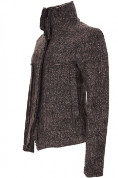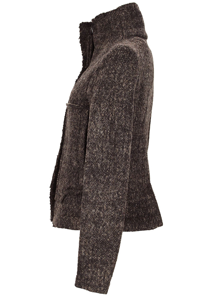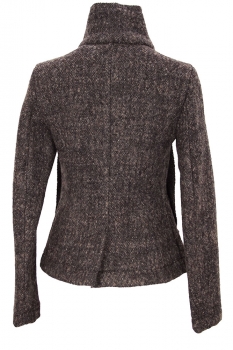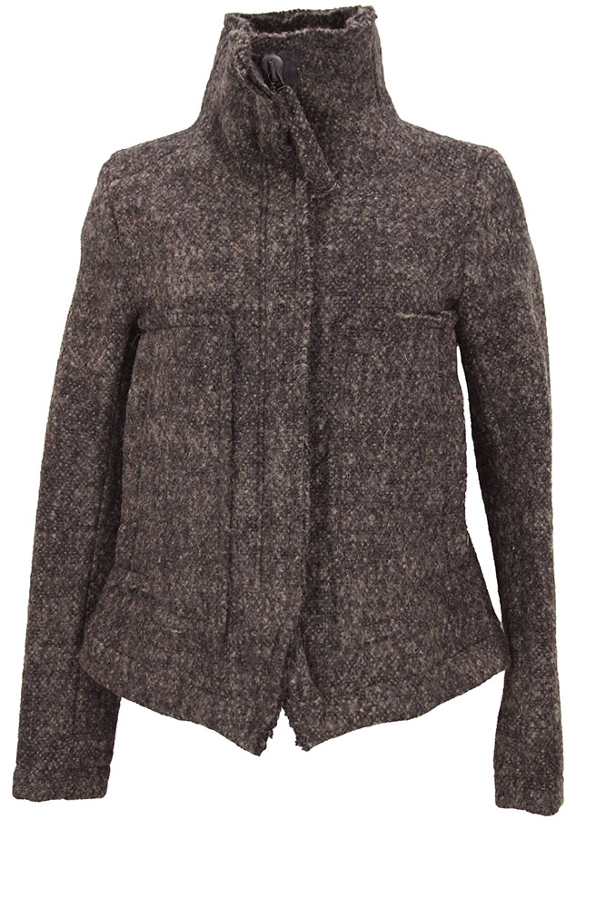 Rundholz Mainline Collection Short, heavy wool zip jacket in turf mel colour. Double layered raised round neck, with raw edge and stitch finish. Large, double zip fastening down the front, with fabric pulls and double layered covering placket. 2 long, side entry patch pockets. Turned, double layer cuff panels. Turned, finished hems. Short central vent at rear. All seams inside are taped. The fabric is a beautiful heavy weight marl. Great Winter, smart, short fitted jacket