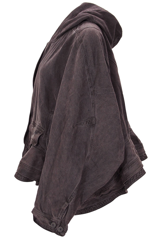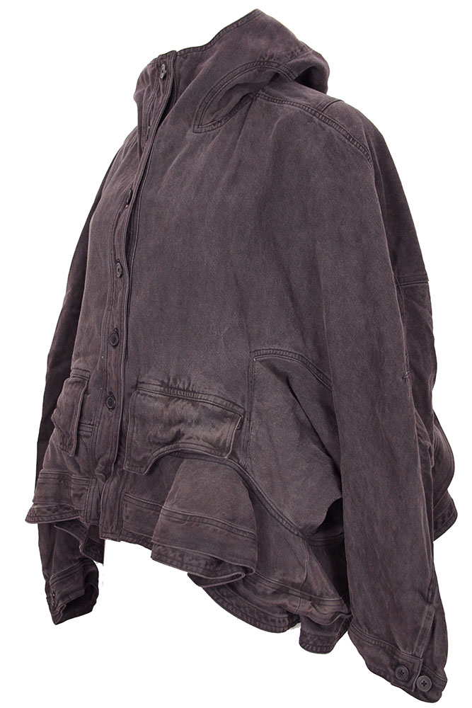 Rundholz Mainline Collection Short, Hooded jacket with flare body and button fastening in Turf wash colour. Hood with double layer trim. 6 button fastening down the front. Bat wing style arms, extending from the flaring body section. 2 button cuffs on double layer cuff panel. 2 pockets with shaped flaps. Double layer peplum, with under layer extending below the outer layer. Very wide body for a beautiful drape. Shaped and curving seams.