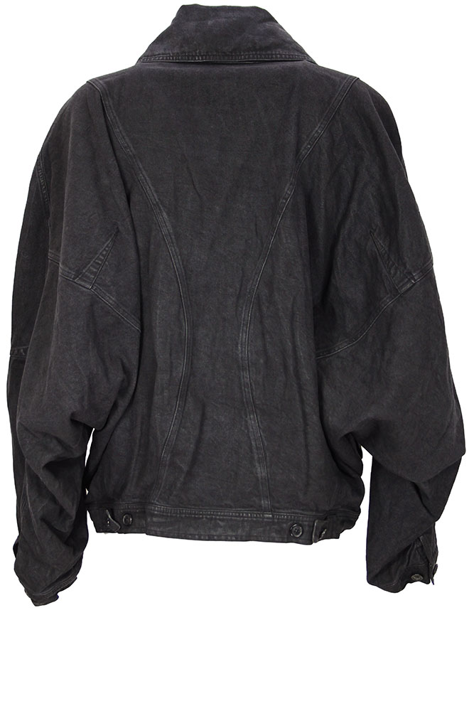 Rundholz Mainline Collection over-sized (wide), over-dyed and distressed jacket in black gloss colour. Collar with large notched lapels. 5 button fastening. 2 large and elaborate concertina style pockets with rounded cut-away flaps and additional pocket behind each concertina style pocket with side-entry. Double layered waistband with fabric tab and button adjusters. Cuffs with double layer panel and 2 button fastening.