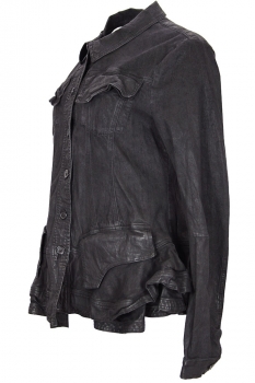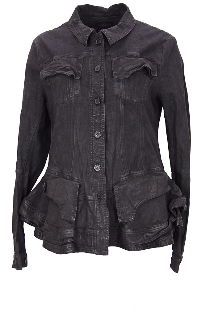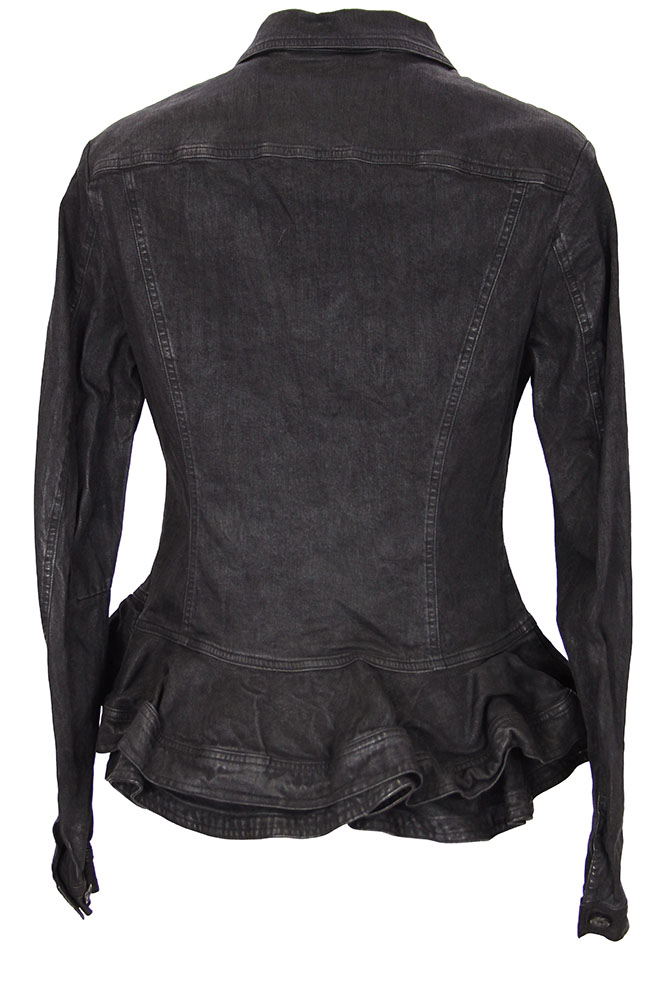Rundholz Mainline Collection over-dyed and distressed, 4 pocket jacket in black gloss colour. Small collar. 6 button fastening down the front. 2 chest pockets with elaborate shaped flaps and 2 main pockets with the same. Double peplum style with lower layer extending from behind the front layer. Double layer cuff panels with 2 button fastenings. Curved seams and with a beautiful flare out.