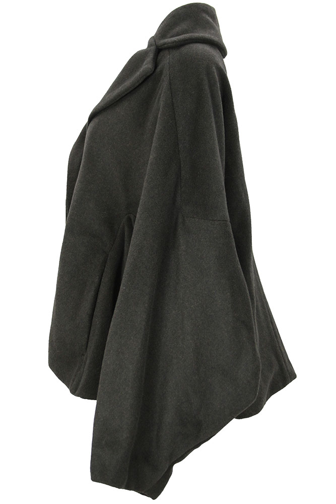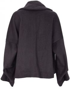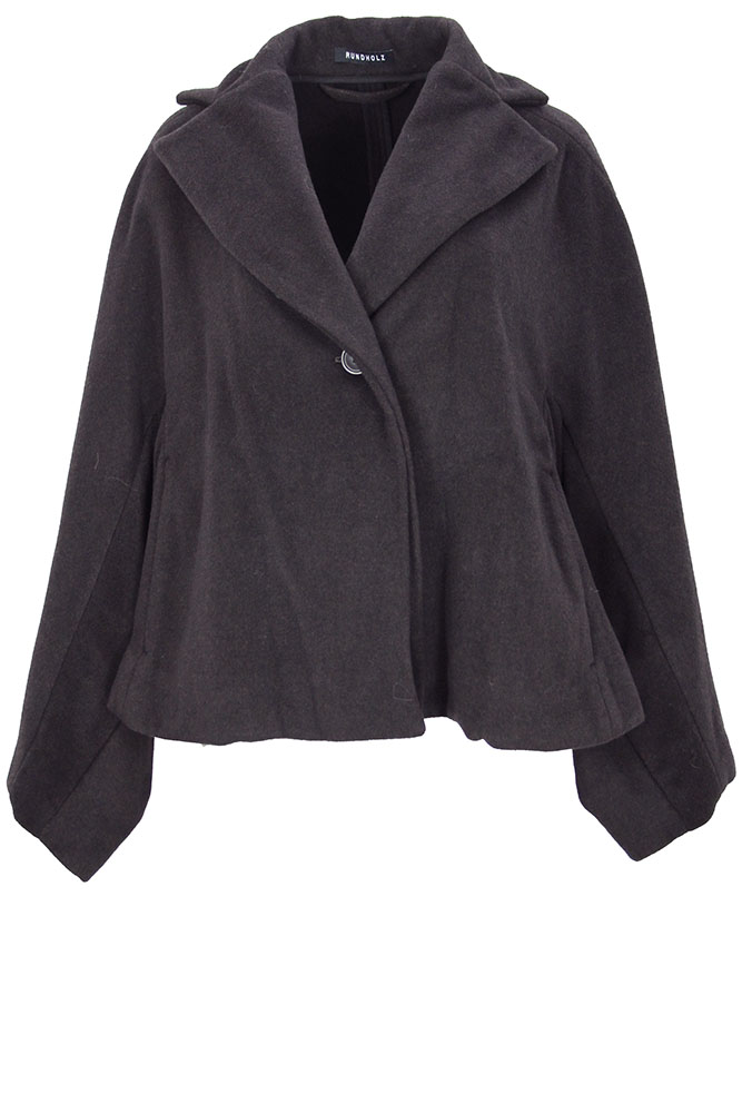 Rundholz Mainline Collection short jacket in wool mix, turf colour. Very wide to give a beautiful drape. Very large collar with notched lapels. 3 button fastening thew 2 lower button covered by placket. 2 side pockets. Wide, articulated sleeves with rolled cuffs. All inner seams are taped. A great jacket in a warm and very cosy fabric. Size Small but will fit small and medium
