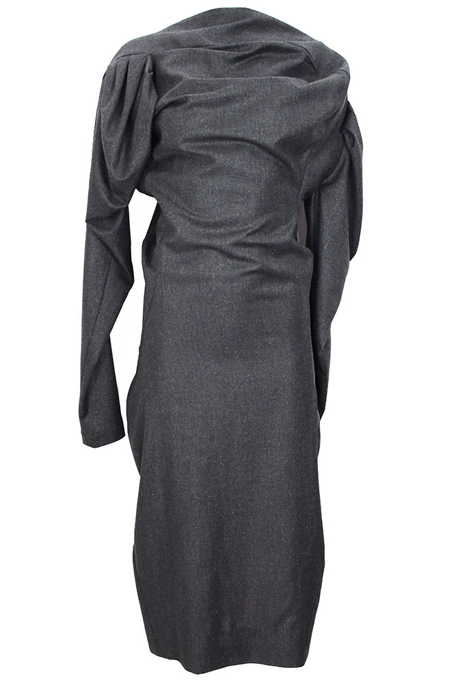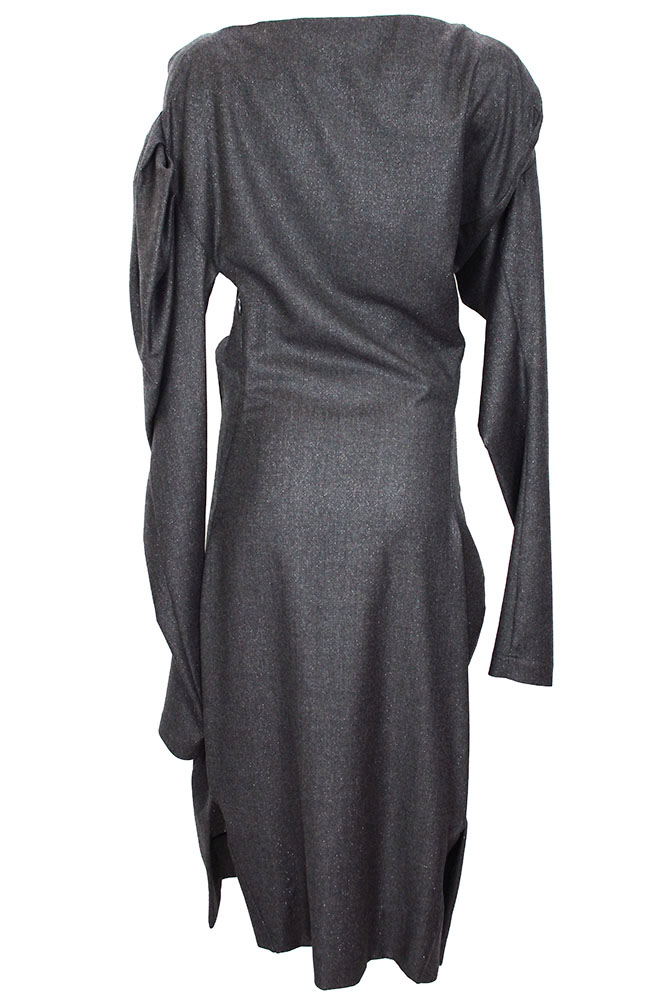 Rundholz Mainline Collection Full Length, Long Sleeved, Superbo Dress in Charcoal Metallic Brushed Wool. Slash neck with double layered panel. Puffed shoulders. Very long sleeves to allow them to be ruched. Tapering in at the hem with side vents. The fabric is charcoal with metallic sparkle.