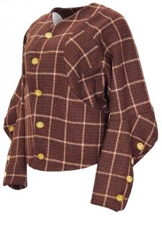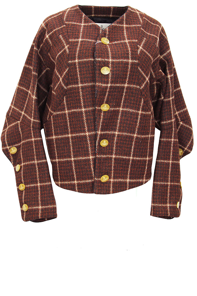 Vivienne Westwood Pourpoint Jacket in brown check Harris Tweed. Collarless with rolled tape finished edging. 5 button fastening, buttons are large amber ovals with orb design. 2 angled pockets at the front. Elaborate sleeve, wide at the shoulder and tapering down to the cuffs. Long, double layered cuff panels with 4 button fastening (large Oval orb buttons) and rolled edging. Front panels are double layered. Fully lined in quilted black fabric. A beautiful Harris Tweed Jacket.
