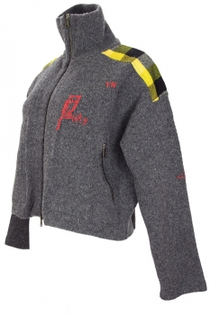Vivienne Westwood Logo Zip-Up Cardigan in grey knit with check shoulders and cat design on chest in red and embroidered logo on left sleeve. Double layered soft high neck. Full length double zip down the front. 2 angled zip pockets.