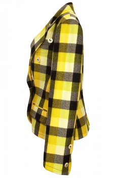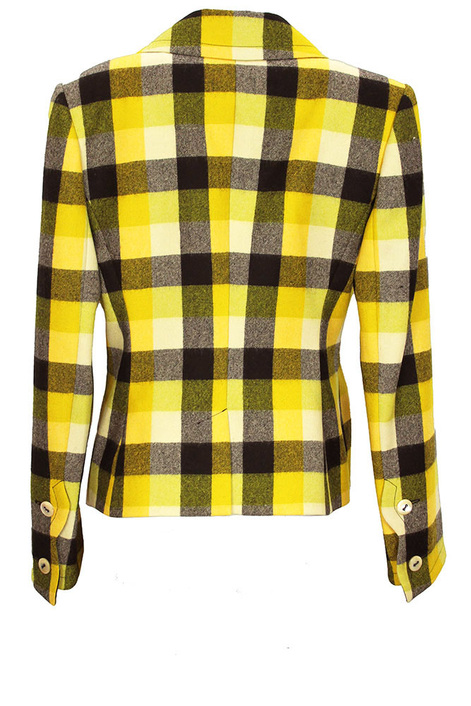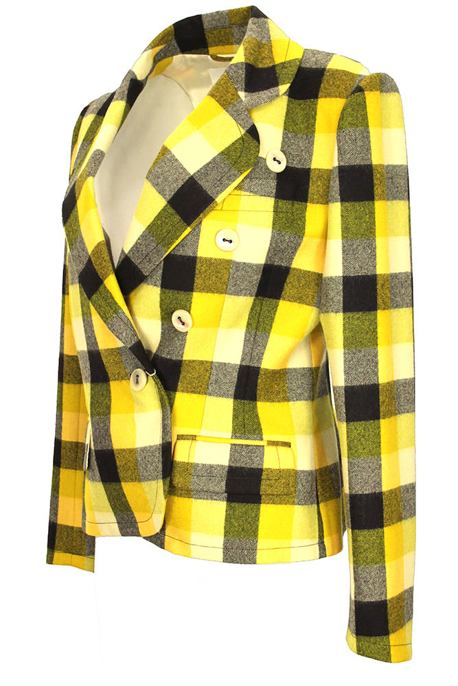 Vivienne Westwood Georgia, double-breasted Jacket in Lochcarron Pixel Check Checked Wool. 2 fastening buttons, 1 inside 1 outside and 3 decorative buttons. All buttons are large mother of pearl style with dark stitching. Large rounded collar with rounded notches. 2 small pockets with flaps and finished trim. 2 button working cuffs with scalloped design fabric edges. Small central vent at rear. Fully lined in orb fabric.