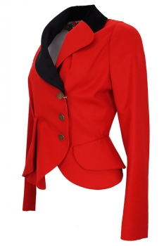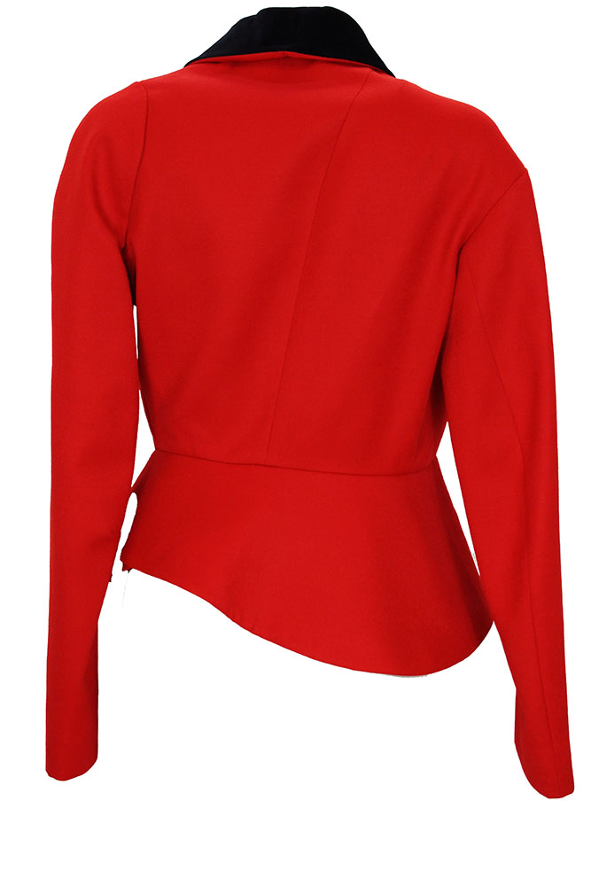 Vivienne Westwood Stormy, double-breasted Jacket in red worsted wool with black velvet collar. Asymmetric collar, the left side with overlapping notch. 3 button fastening and single button inside, metal roman coin style buttons. Asymmetric peplum which extends around the side to the front providing the flaps for the small pockets. Plain cuffs. Dart detail. Longer on the right side. Fully lined in orb design fabric.