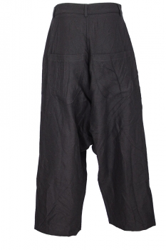 Marc Point low drop crotch, wide legged trousers in crinkled design black wool. Waistband with belt loops and single button fastening. Long fly with 4 buttons and covering placket. 2 angled side pockets and 2 patch pockets at the rear with rounded bases.