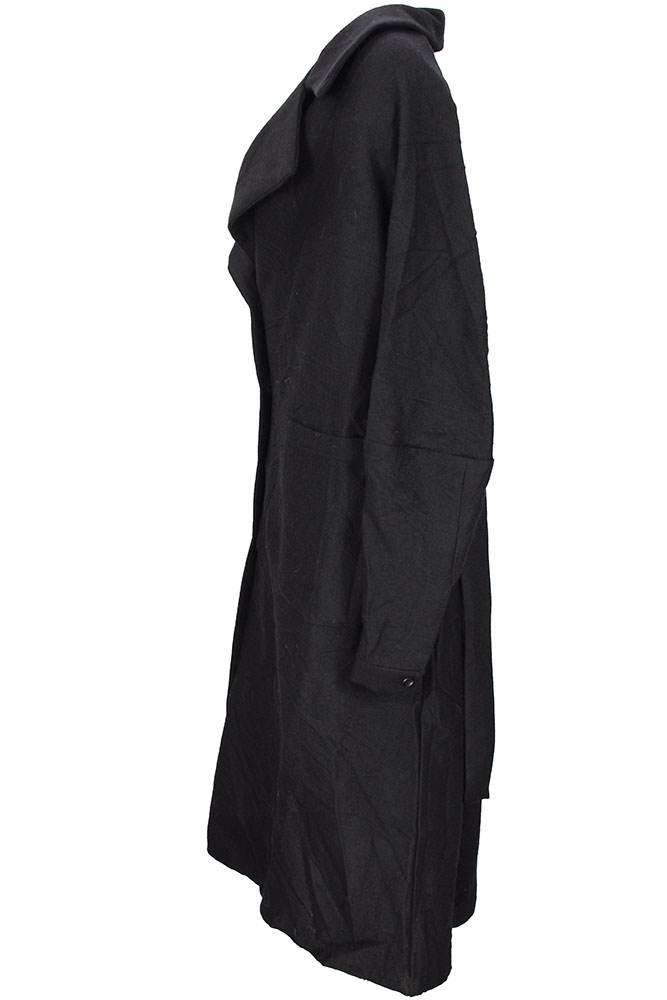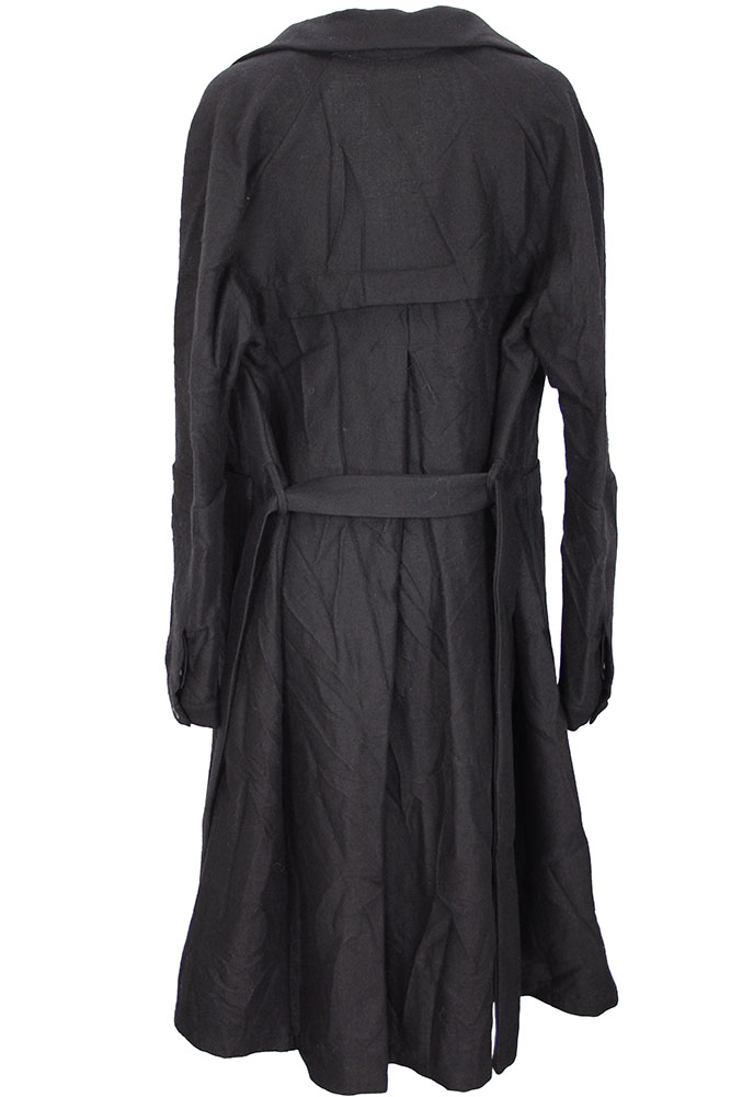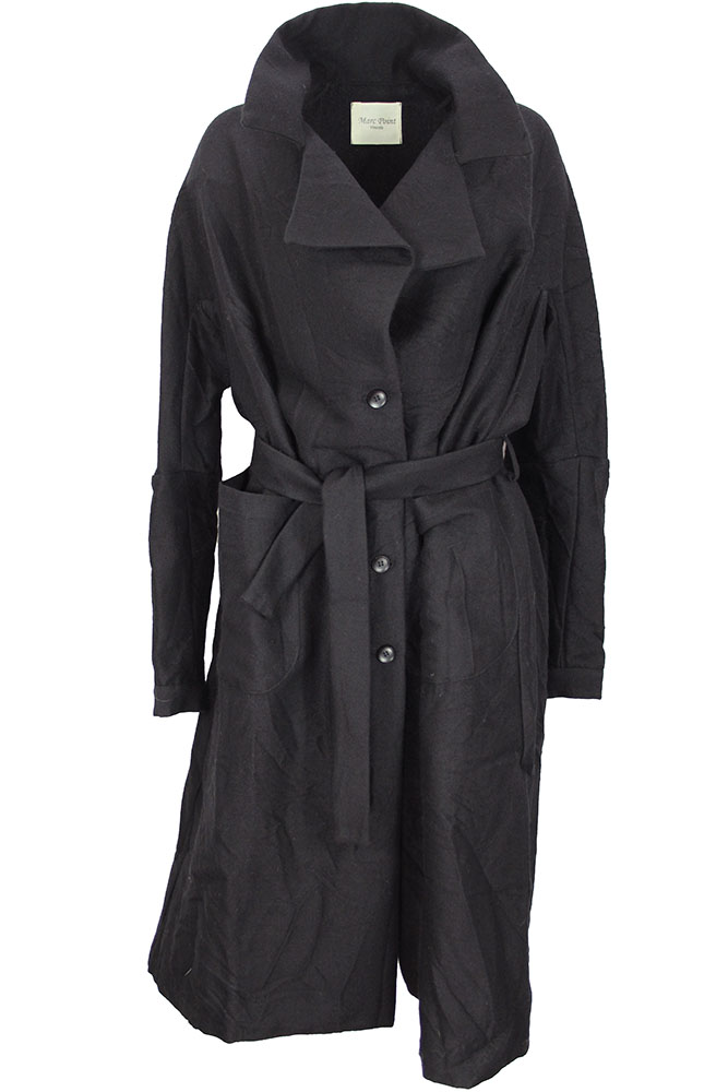 Marc Point 4 button fastening, belted coat in black crinkled wool design. Very large, double layer fabric collar with notched lapels. 2 large patch pockets with curved bases. 3 button working cuffs. Folded fabric panel detail at rear, with box pleat below. Belt loops and plain tie-up fabric belt. A beautiful, full shaped coat. Size 42 but will easily fit a 44.