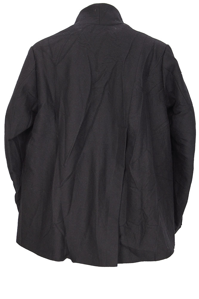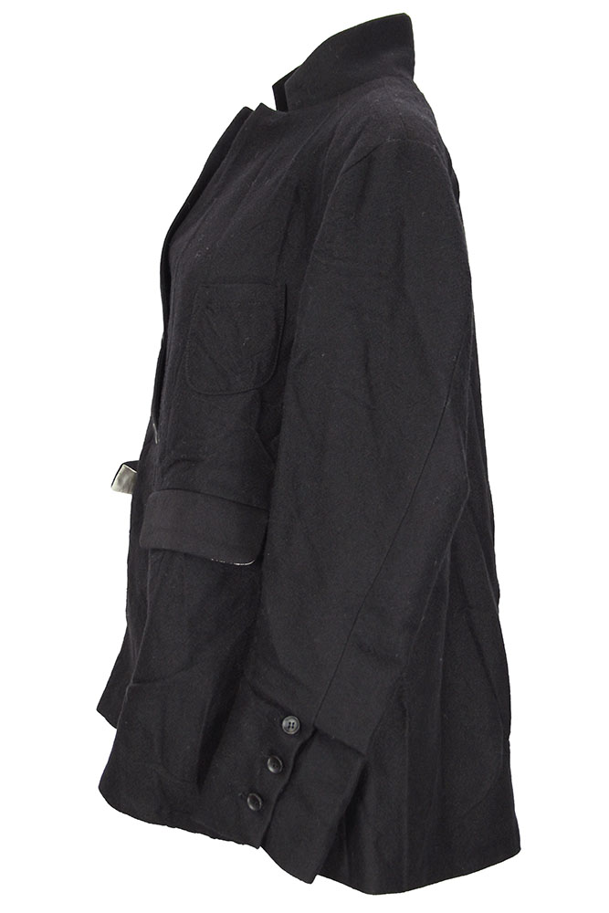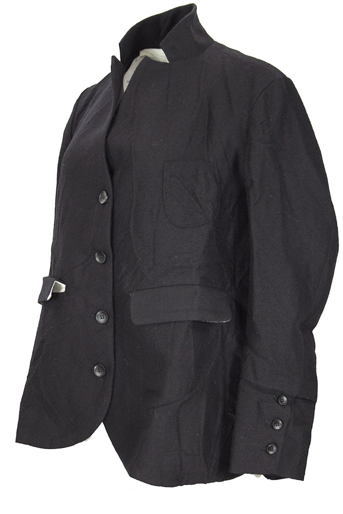 Marc Point 4 button fastening, cut-away style, jacket in black crinkled wool design. Small collar with notched lapels, collar can be worn up. 2 pockets with flaps. A small left chest pocket with rounded base. 3 button working cuffs. Long diagonal vent at rear with button fastening. Fully lined in textured off-white fabric. sizes 8 and 10 Uk 40 and 42 Italian