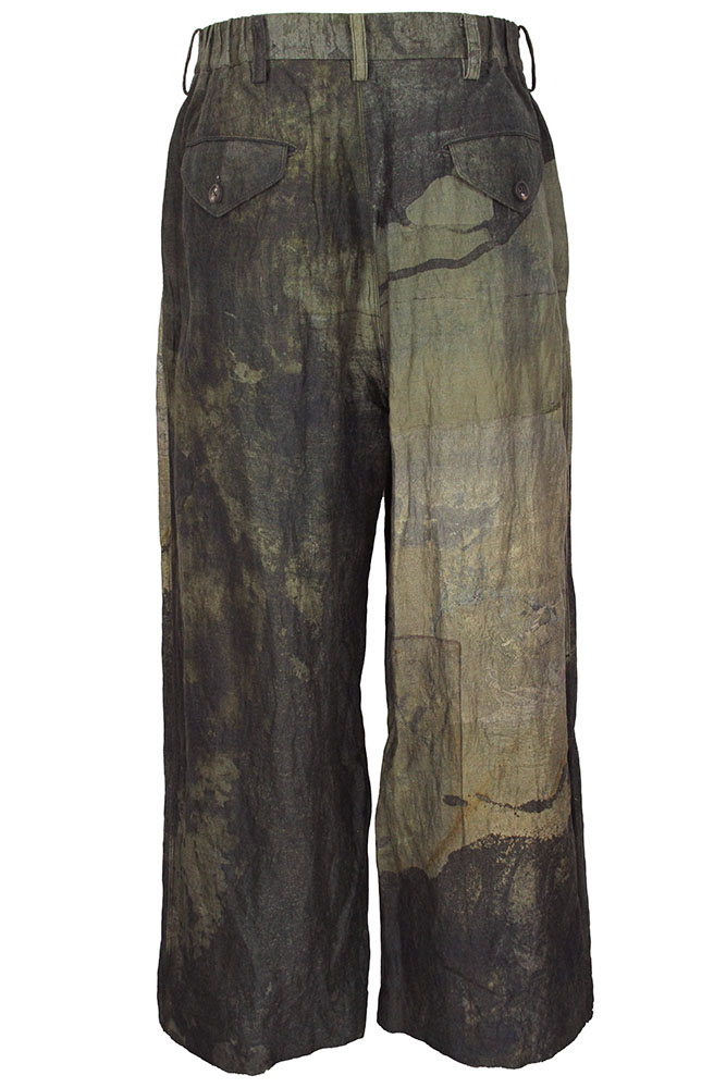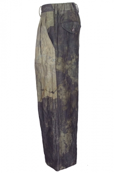 Ziggy Chen double pleat trousers in a distress print. Waistband with belt loops and single button fastening and additional button fastening inside. Zip fly with covering placket. 2 angled side pockets with stitch details and 2 rear pockets with shaped flaps and button fastenings. Finished hems. Fully lined to the hem. Amazing trousers in a wonderful cotton/wool/metal fabric. Generously sized