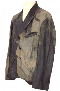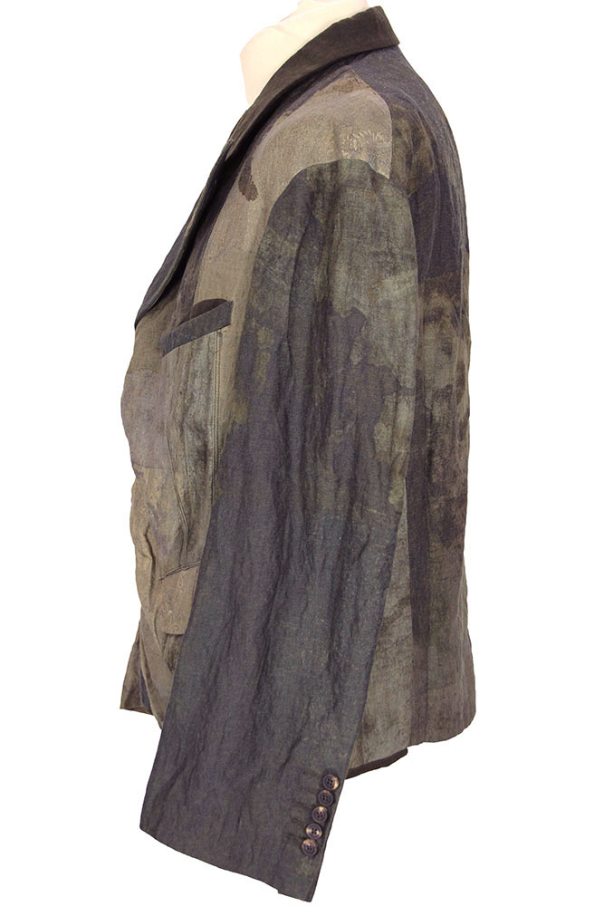 Ziggy Chen 3 button jacket in a distress print. Collar with notched lapels, the upper collar is in a block brown fabric, the lower lapels are in the printed fabric. The garment can be buttoned up to the neck, with the lapels up. The 3 button fastenings are staggered to gather the fabric slightly. Left chest pocket. 2 main pockets with flaps. 5 button working cuffs. The front panels are longer than the rear, where the hem curves upwards, the base of the inner pockets are revealed below the hem. Fully lined. As usual this garment is impeccable in its construction and design and of the very finest quality. Exceptional.