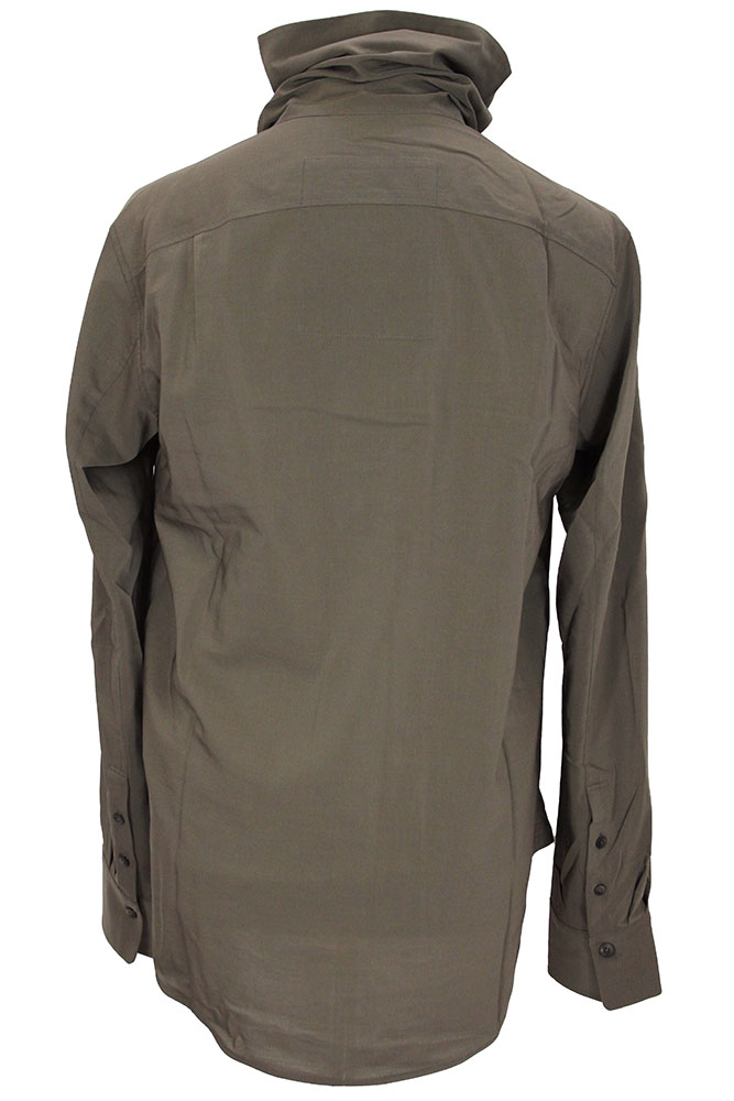 Ziggy Chen high necked shirt in a very fine wool/cotton mix. 9 button fastening, including the slightly smaller buttons on the high, soft collar. 3 button cuffs with pleats. Rounded hems and longer at the rear. Curved cut-aways at each side at hem. Hem has striped fabric inside piping and lined at the upper shoulders. Beautiful soft fabric shirt.
