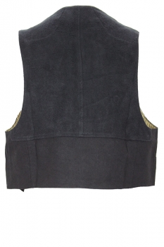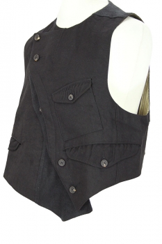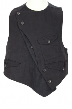 Ziggy Chen mixed fabric, diagonal fastening waistcoat (vest) in black. Round neck, with cross-over panel. 7 button, diagonal fastening, with the 4th,5th and 6th buttons on a soft linen wool mix fabric base with the main fabric as a curved placket. 1 angled left-side patch pocket with flap and button fastening and 2 wide main pockets with gathered flaps and button fastening. The upper rear panel is in a soft linen wool mix, with the heavier main fabric forming the lower panel. The front panels are fully lined in 100% khaki coloured cotton and striped distressed fabric. The rear is lined in the striped distressed fabric. An Wonderful piece of clothing.