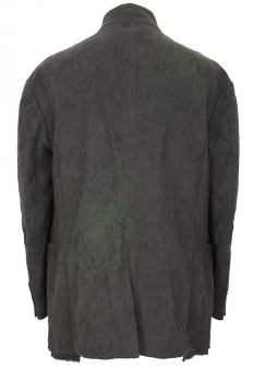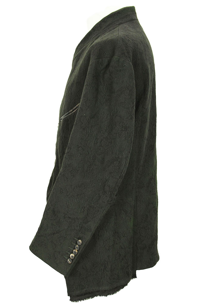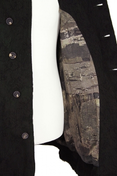 Ziggy Chen 5 button, mixed brocade fabric jacket in cotton/wool mix. High neck with notches. The left front panel is curved with the button fastenings fooling the curve and is in a rich, dark brocade. the right panel in in a dark petrol coloured brocade. 5 button fastening. Curved, left chest pocket with print fabric trim and inside button and loop fastening. The 2 main pockets have a finishing trim. 5 button working cuffs. Central vent at rear. The front panels are slightly longer than the rear panels. The side hems have raw edged panels, extending below the hem. Fully lined in printed silk and the sleeves in distressed striped fabric. Single pocket with flap and button fastening inside.