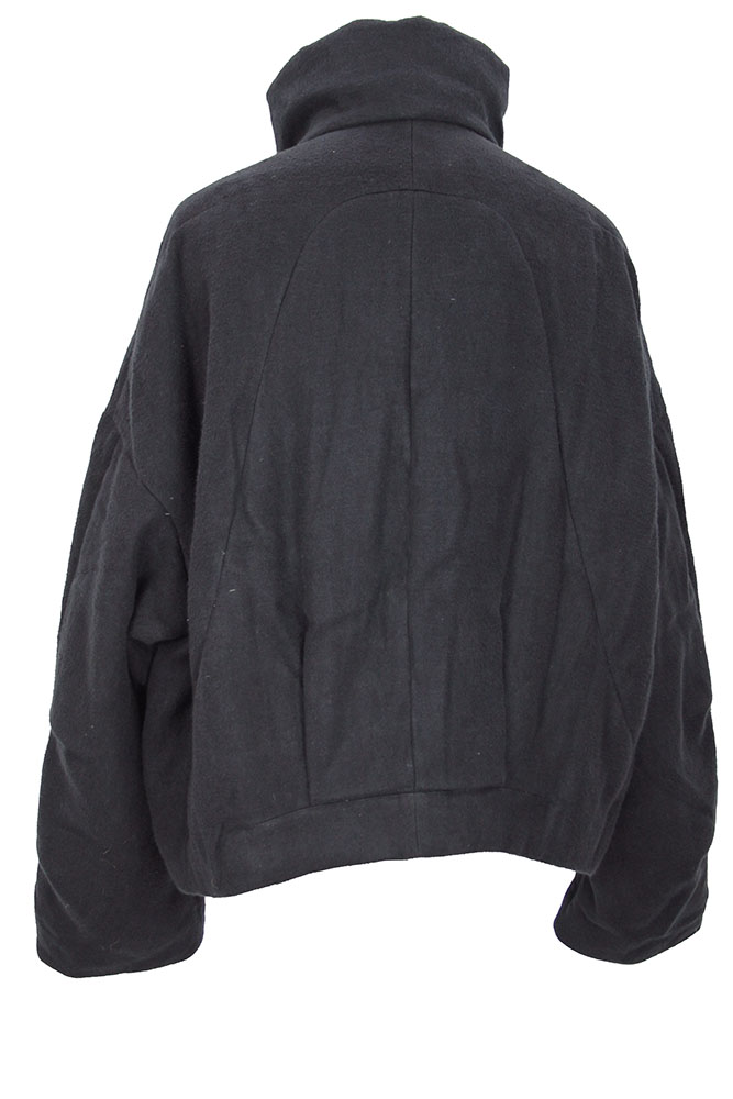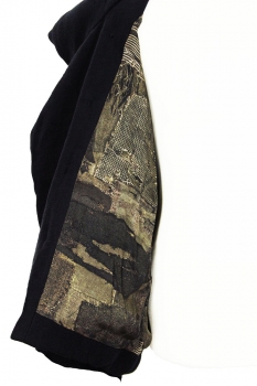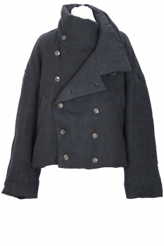 Ziggy Chen padded, goose down filled, double-breasted jacket in super soft fabric. High padded collar. 2 rows of 5 buttons fastening and a single button and loop fastening at neck. 2 angle pockets with trim. Turned cuffs. Curved panel insets at rear. Fully lined in printed silk and with a single inside pocket with flap and button fastening. Sleeves are lined in distressed striped fabric. A superb winter jacket which will fit many sizes, I am a size 52IT and it fits me perfectly, works well is oversized, so do not be put off by the small size label, as often with Ziggy Chen the garments are beautifully oversized.