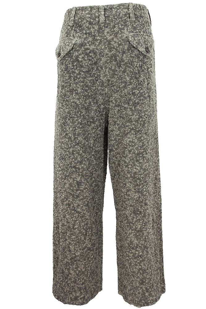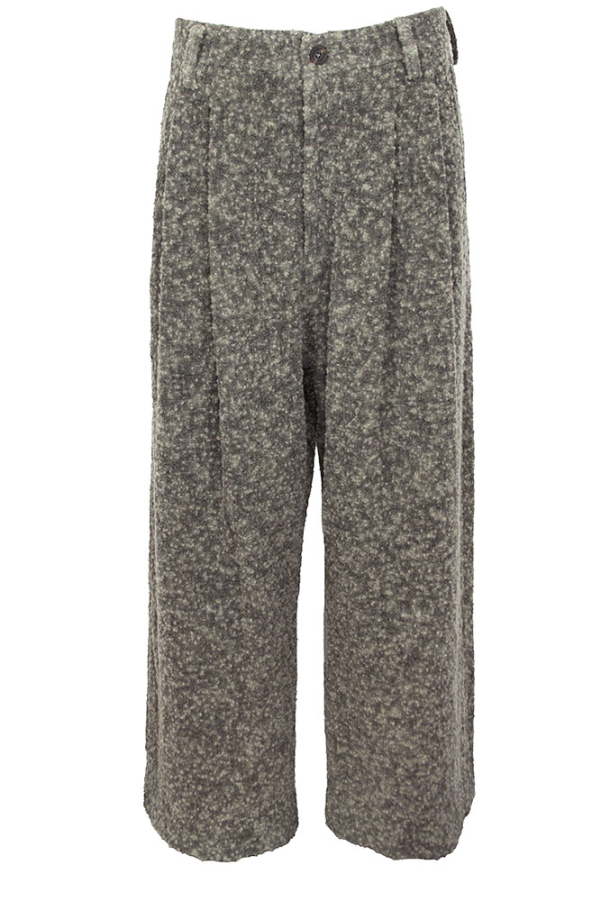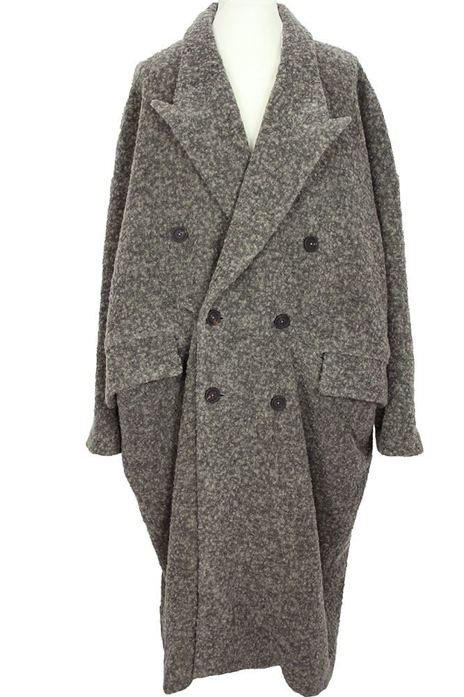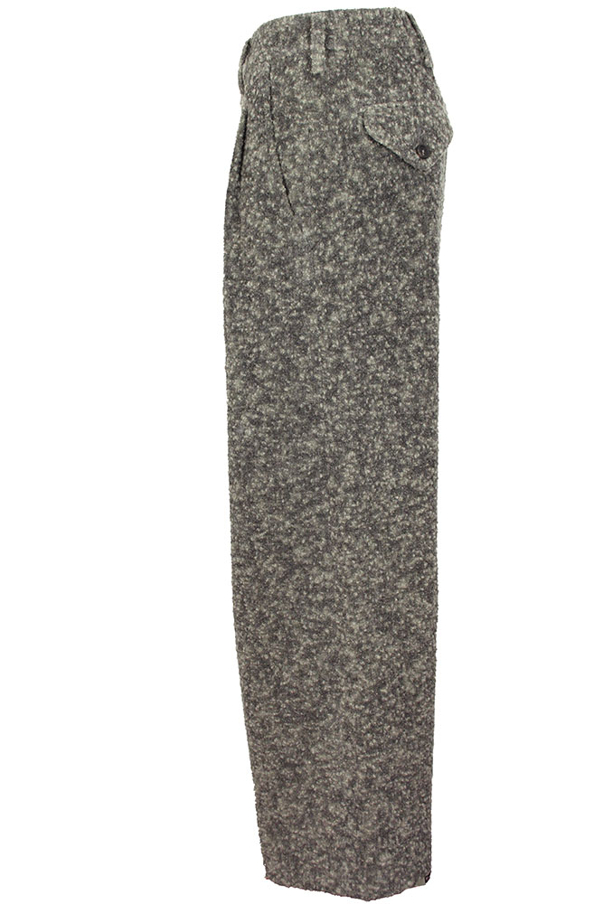 Ziggy Chen wide legged, oversized, double pleated trousers in heavy grey marl, textured fabric. Elasticated waistband with belt loops and single button fastening and additional button fastening inside. Zip fly. 2 angled side pockets and 2 rear pockets with flaps and button fastenings. Very wide legs with finished, turned hems. Fully lined in Cotton and Cupronickel and cotton. Stunning trousers that match the oversized coat in the same fabric.