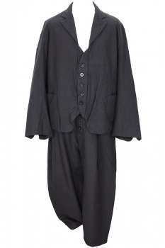 Klasica slightly low drop crotch, single pleat 'Victor' trousers in coal black Alexander twill Matt mix. Waistband with long belt loops and small 'v' notch at rear, the rear raises elegantly upwards. Hook fastening. 9 button fly, with visible buttons. 2 angled side pockets. 2 rear pockets with flaps and visible seam down the rear of each leg. Plain finished hems. Lined only on waistband and just belo and behind fly.. matches the jackets in the same fabric.