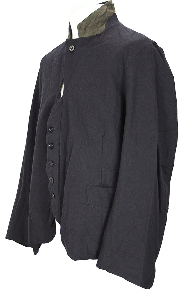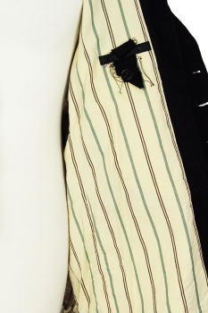 Klasica 'Ardoise' Jacket) in coal black Alexander Twill Matt Mix fabric.'Collar with notched lapels and button fastening at neck. 5 button fastening on inset panels giving the effect of a waistcoat. Cut-away style. 2 pockets either side of the button panels, hidden in seams. 2 main pockets with finishing trim. Curved vented cuffs. Small patch pocket inside. Fully lined in striped fabric.