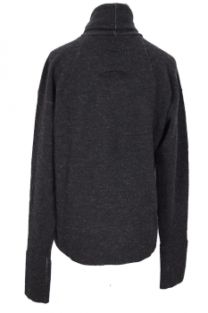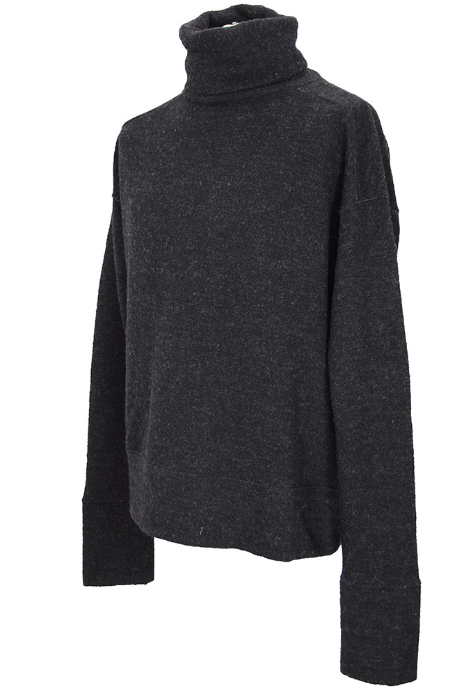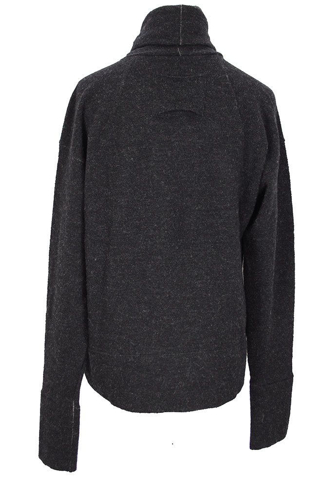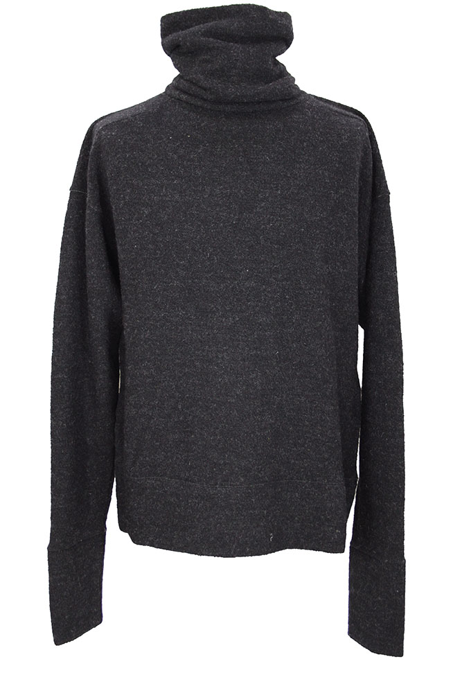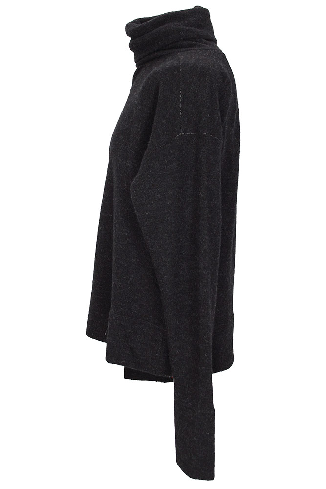 Klasica 'Marquis' turtleneck jumper in carbon coloured shetland wool. High, full and soft collar. Double layered neck. Deep double layered cuff panels and deep double layered hem. Subtle white stitch detail at seams. Open panel at top of rear, below neck.