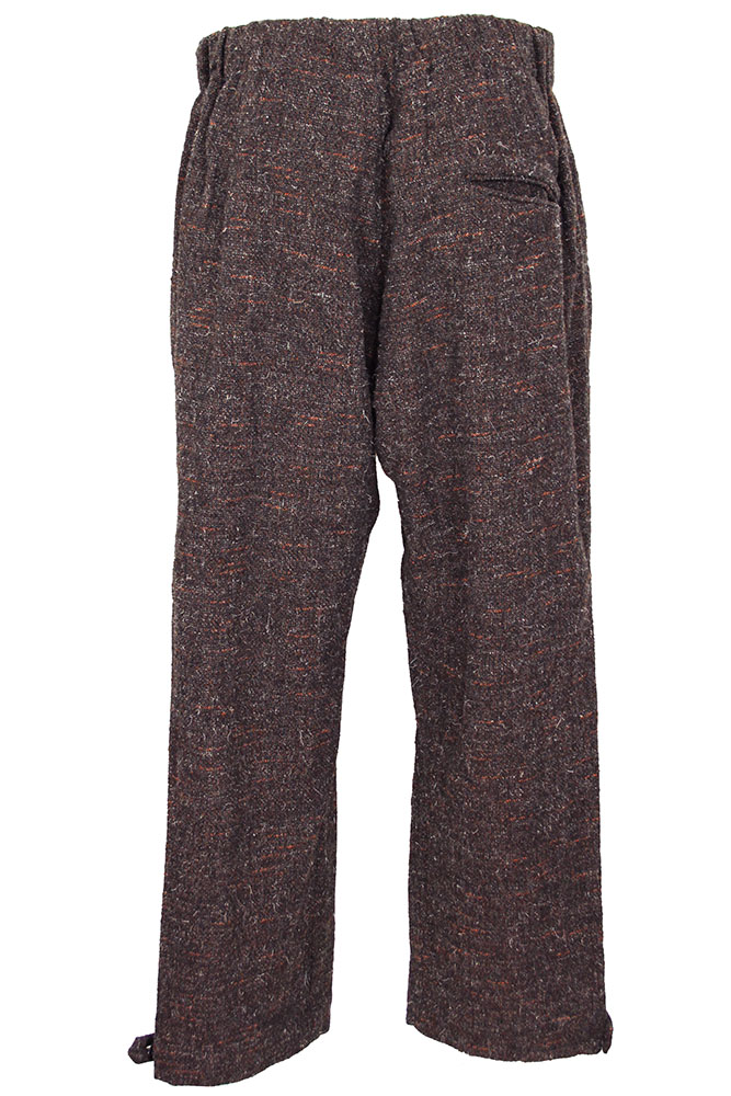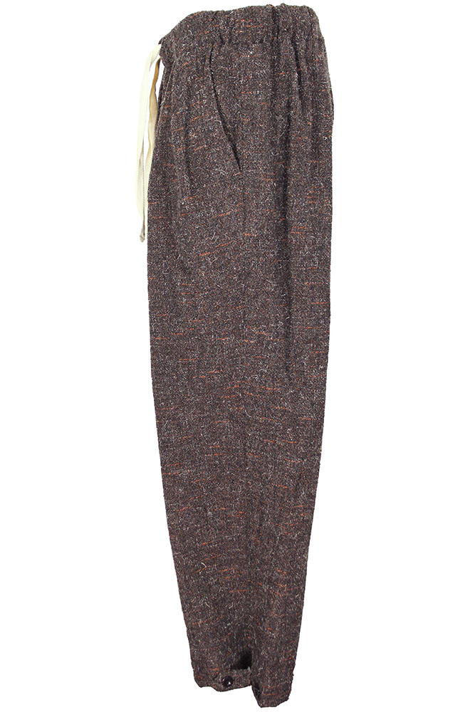 Klasica 'Souk' trousers in regenerated Kemp mixed tweed in mix brown colour. Elasticated waistband with natural coloured drawstring. Single pleated. 2 side pockets and a single rear pocket with finished trim. Finished hems with fabric tab and button adjustments. Lined in black to below the knees. These trousers match the other garments in the same tweed fabric.
