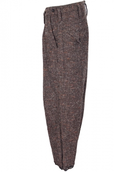 Klasica low drop crotch 'Galway' trousers in regenerated kemp mixed tweed. Waistband with long belt loops and buttons for braces and small 'v' notch at rear, the rear raises elegantly upwards. Hook fastening. 4 button fly with covering placket. 2 angled side pockets and small ticket pocket on the right side with finishing trim. 2 rear pockets, the left rear pocket has a triangular flap and button fastening and the right side just a finishing trim. Raw edged hem with extending raw edged lining in striped fabric. Lined to the knees in black.