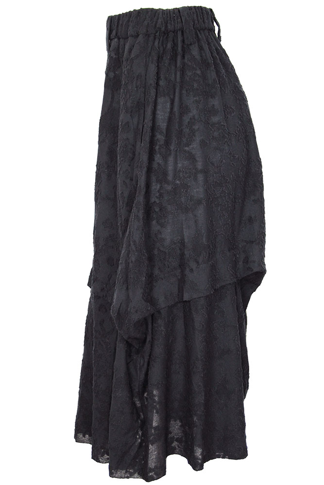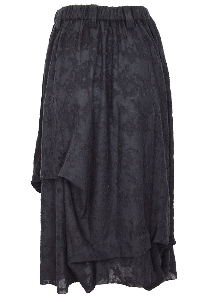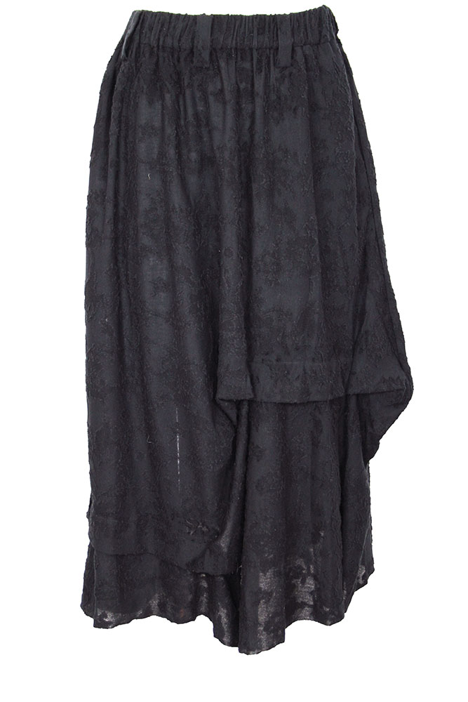 Chiahung Su soft linen brocade skirt in black. Elasticated, gathered waistband with belt loops. 2 side pockets. Asymmetric shape with overlapping fabric. Raw edged hem. A stunning skirt in a beautifully soft organic linen.