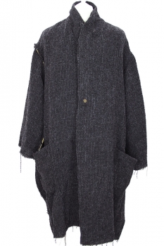 Chiahung Su Handwoven organic Japanese wool oversized coat in black and blue/grey. Double layered collar with sewn notched lapels, looks great worn up. Single button fastening, handmade button from an old Taiwanese coin, with small metal reinforcing button inside. 2 large patch pockets and raw edged cuffs. Very wide and oversized on the body, for an amazing drape. Raw edged seams with the lining showing. Folded fabric detail. Raw edging at hems. This shape is a classic for Chiahung Su and we love it. The piece is completely different to anything else and shows a wonderful appreciation of shape, drape and form, in what would at first glance appear to be formless. Fully lined in woven, patterned Japanese silk and with 2 inside pockets. Stunning!!! (will fit many sizes)