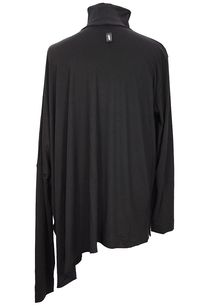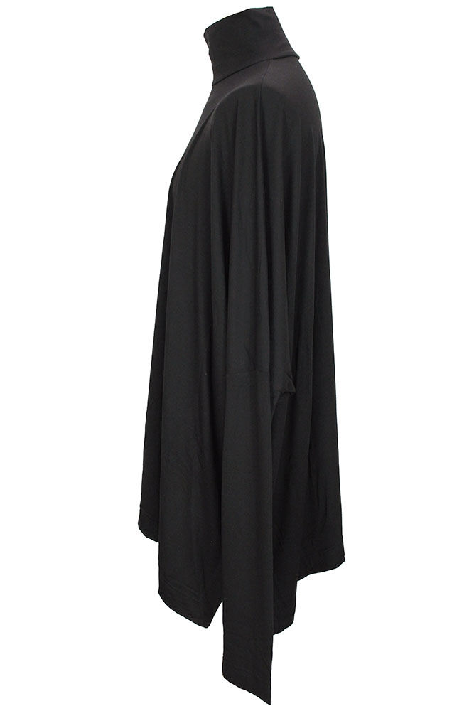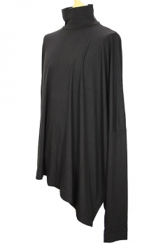 David's Road black, long sleeved, turtleneck, asymmetric dress in stretch jersey. Double layered turtleneck. Long sleeves with finished cuffs. Longer on the left side, creating an elegant and sexy look. Finished hems.