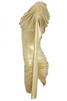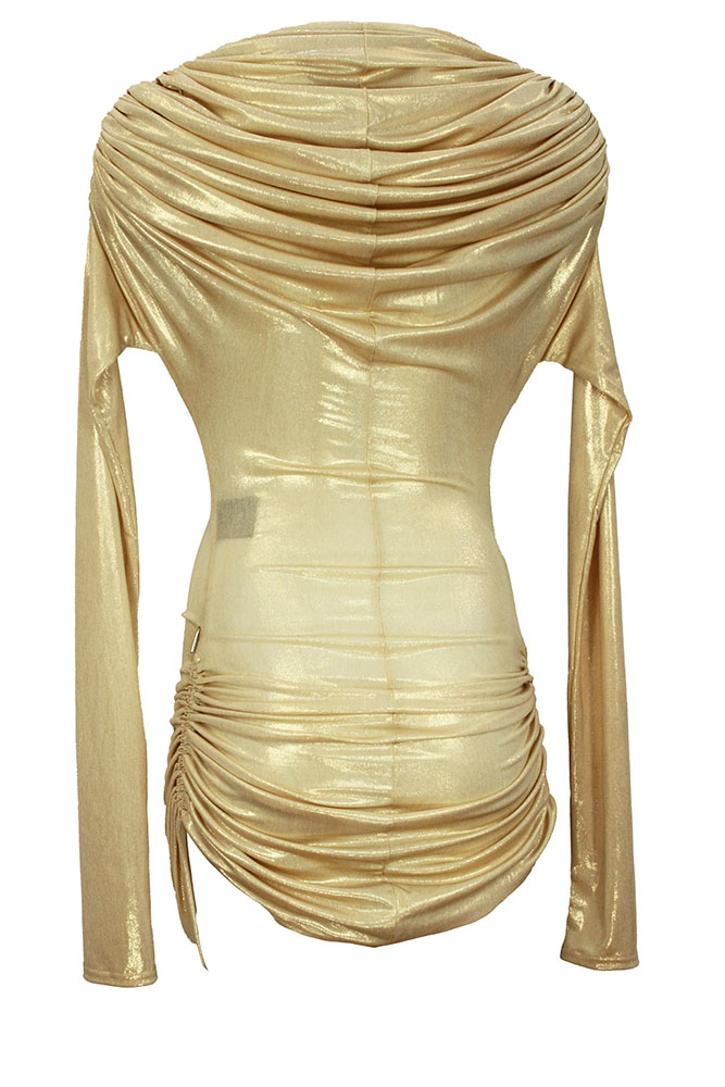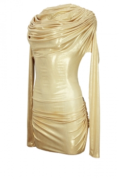 David's Road stretch, long sleeved, draping mini dress in gold. A stunning short dress with elaborate gathering and ruching, particularly stylish and very sexy. Simple round neck, with elaborate drapes. Wonderful!