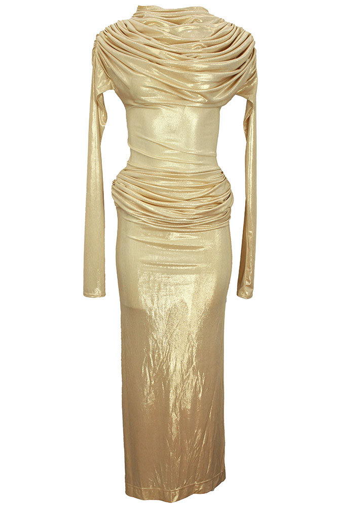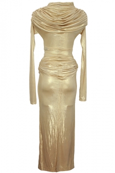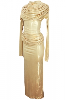 David's Road stretch, long sleeved, draping, full-length dress in gold. A stunning long dress with elaborate gathering and ruching, particularly stylish and very sexy. Round neck, with elaborate drapes. Wonderful!