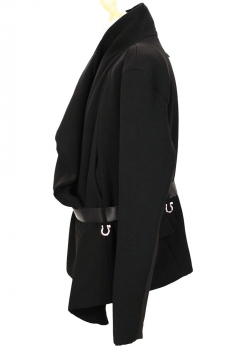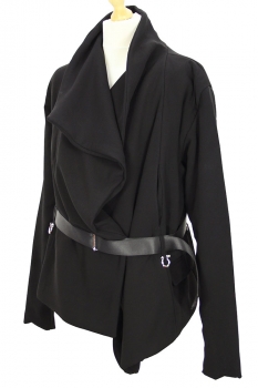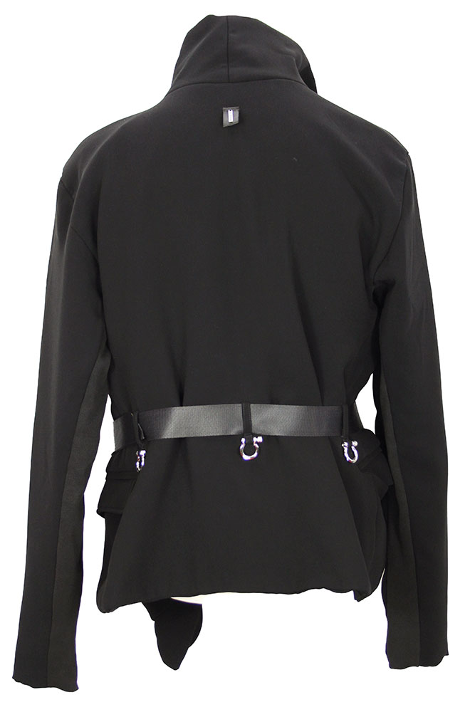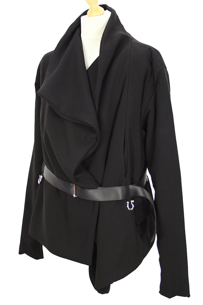 David's Road heavy padded, belted jacket in black Georgette Fabric. Pull-around (either way), double breasted style, with no buttons, the belt is used to close the jacket. Raised neck. fabric belt with metal buckle and belt loops with metal hoops with screw fastenings (can be removed). 2 main pockets with flaps and finishing trim and 2 side entry pockets in the side seams above the main pockets. Padded sleeves with stretch fabric, ribbed inset panels on the underside. A heavy duty, Winter weight jacket with real style.