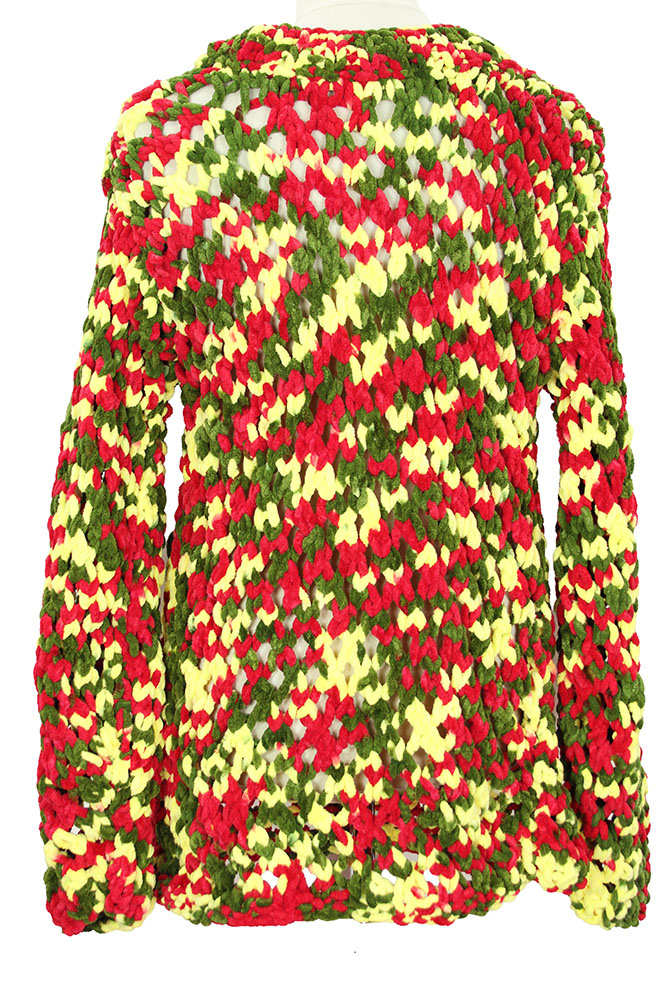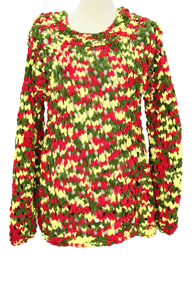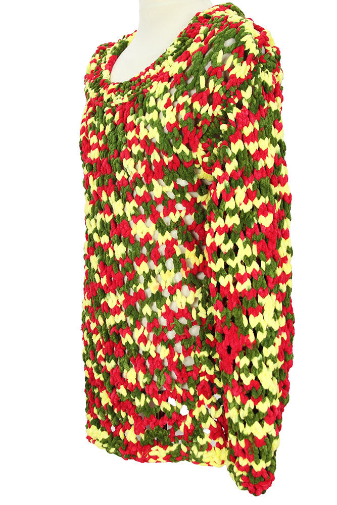 Nicholas Daley one-size, over-sized, crocheted chenille, knitted pullover, with very wide knit. Multi-coloured with green, yellow and reds. Wide, round neck. Long sleeves with plain cuffs. Knit finished hems. A stunning garment, which is a joy to wear. Very soft. The colour combination is called Marigold.