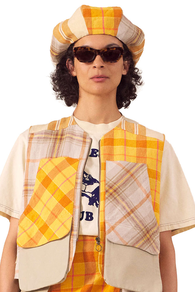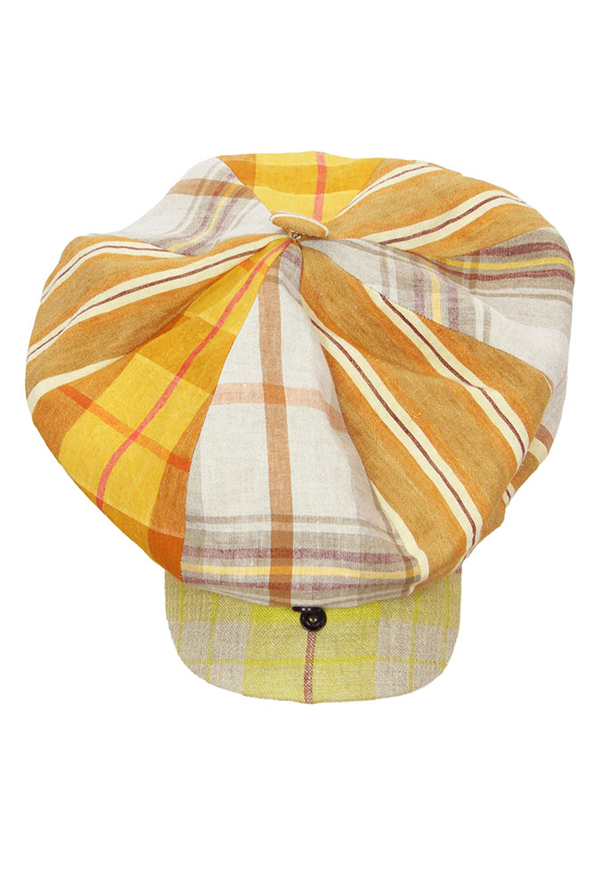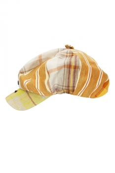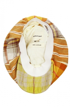 Nicholas Daley one-size, 8 panel, peaked hat in sand mix, striped Combo Linen fabric. Fabric covered button on centre top. Stiff, curved peak with popper fastening so it can open up. Heavy, stretch, white headband. Fully lined in off-white cotton. The fabric is a Nicholas Daley Tartan woven in Ireland. Made in England.