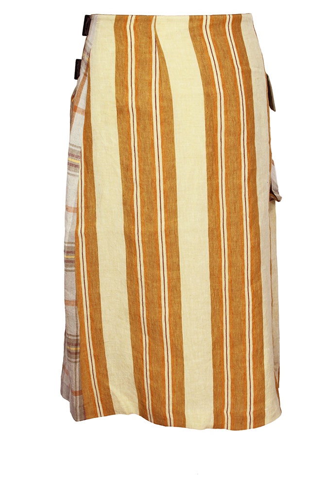 Nicholas Daley Combo Linen, striped kilt in Sand Mix Nicholas Daley Tartan, woven in Ireland, with contrasting cotton attachments. Small folded beige, cotton waistband, with fabric tab and metal loop on right side. Inner velcro fastening and 2 brown leather belt fastening with metal buckles. Sand mix stripe, concertina style pocket on the right side with beige cotton flap. Fully lined in off-white cotton. Made in England Wonderful piece in an extraordinary fabric. Brilliant! Sizes S - 30 inch. M - 32 inch