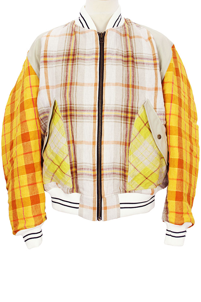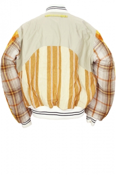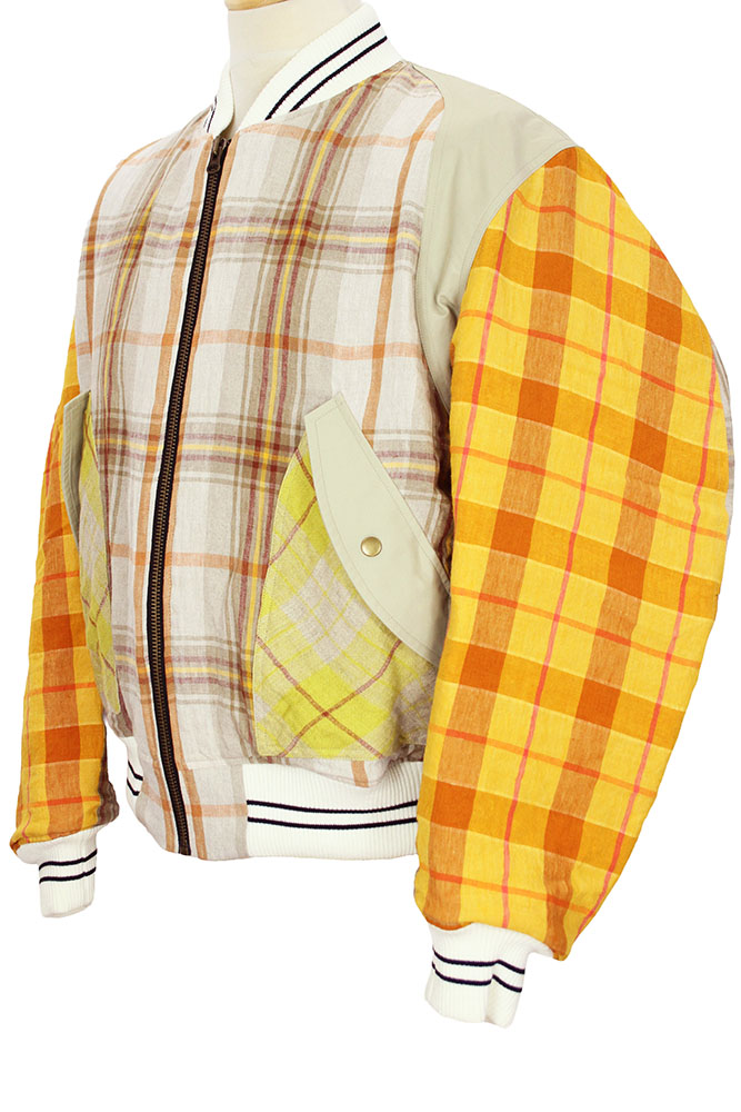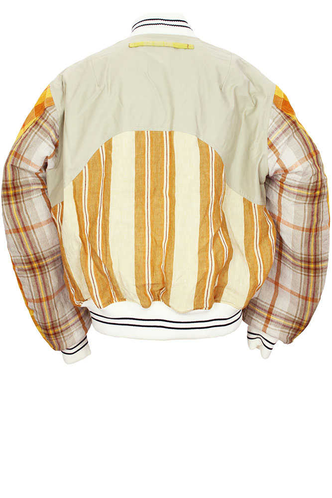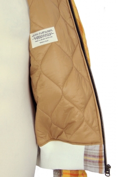 Nicholas Daley Combo Linen, striped, padded, Bomber Jacket in Sand Mix Nicholas Daley Tartan, woven in Ireland, with contrasting beige cotton attachments. Full length, heavy zip down the front. White and black striped, ribbed collar inset. The body and sleeves are all fully padded in quilt style padding. 2 curved front pockets with beige cotton flaps and metal popper fastenings. White with black stripes, elasticated, ribbed cuffs and waistband. Body is padded with light brown quilted fabric and the sleeves in white quilted fabric. Hanging tab at rear below neck. This is a stunning jacket, in one of Nicholas' tartans. Made in England.