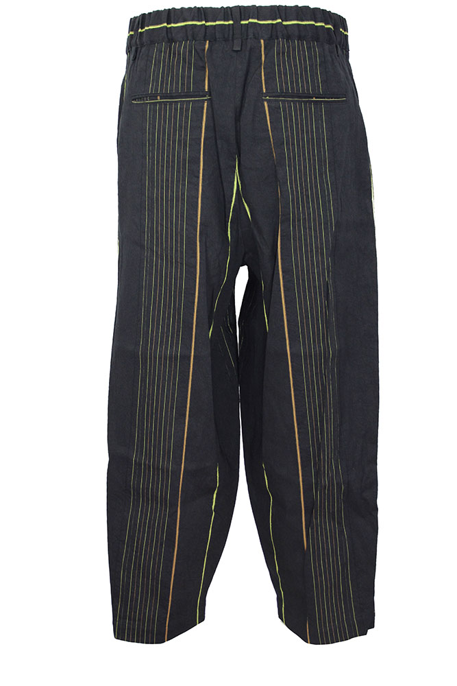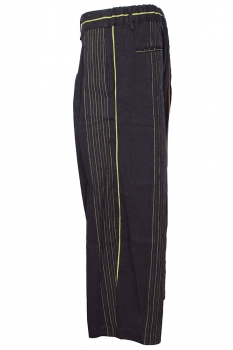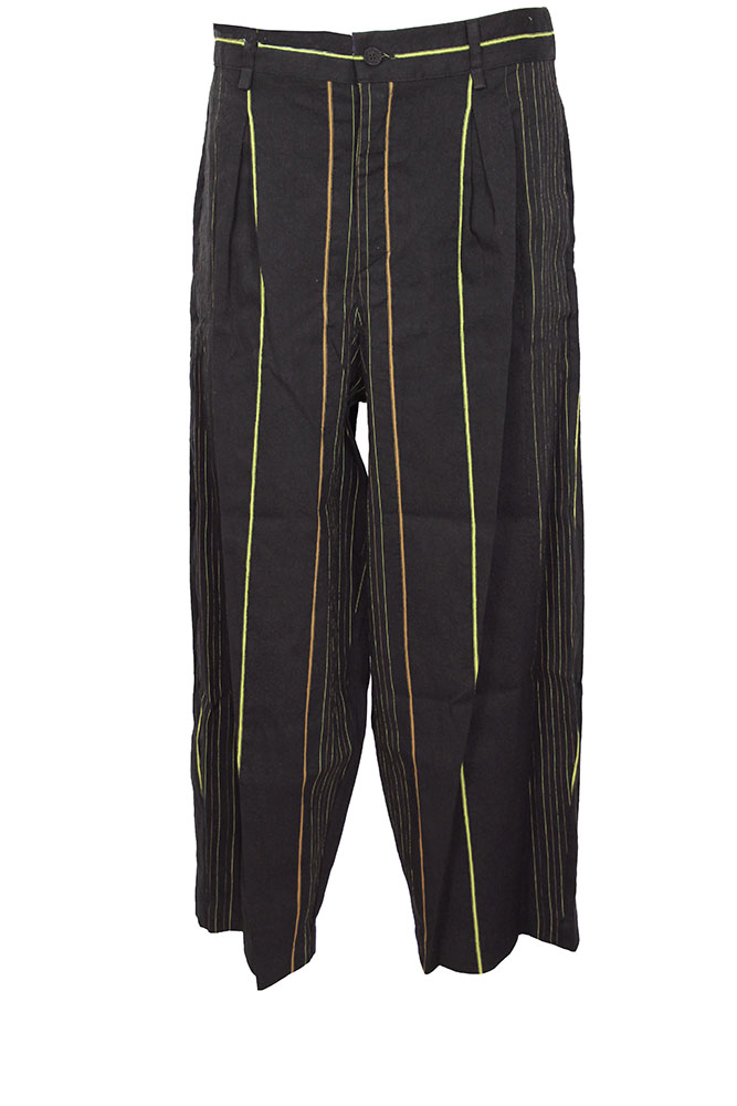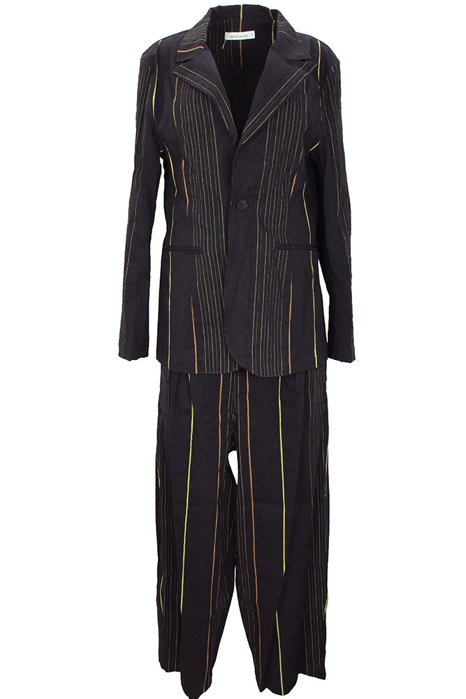 NostraSantissima black pinstriped cotton/linen wide legged trousers. Waistband with elasticated rear, belt loops, with extending loops, and single button fastening. Zip fly. 2 side pockets and 2 rear pockets with finishing trim. The fabric is beautifully textured and has stripes of shades of brown and green. A perfect summer trouser, this garment matches the jacket in the same fabric, making a stunning Summer suit.