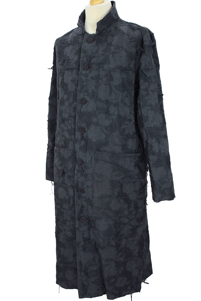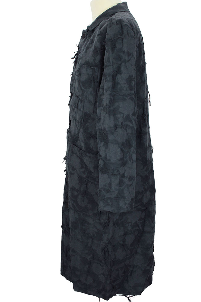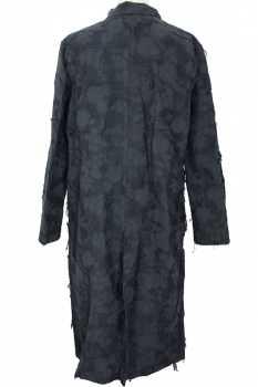NostraSantissima long, buttoned coat in a textured , loose fibred fabric. Double layered soft collar. 7 button fastening down the front, with textured buttons carefully chosen to complement the fabric. Right-side chest pocket. 2 extra large patch pockets with finishing trim. Long, central vent at rear. Partially lined in super-fine, black cotton. Finished hem. Plain turned cuffs. Taped seams inside. A gorgeous coat in a beautiful and interesting fabric.