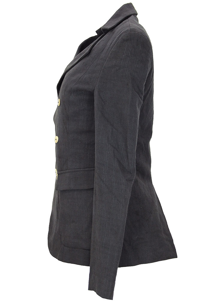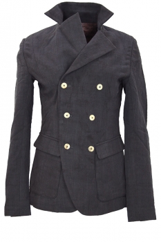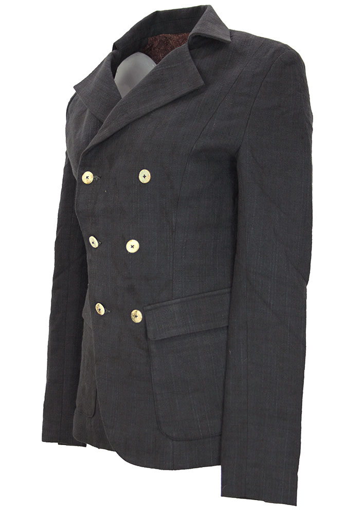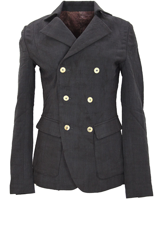 Chiahung Su hand-woven and hand-dyed organic Japanese cotton, double breasted and fitted jacket. 2 columns of 3 buttons. Collar with notched lapels. 2 angled patch pockets with flaps. 2 button working lapels. Central vent at the rear. Single pocket on the inside Fully lined in vintage, woven Japanese patterned silk and lace. All buttons have small reinforcing buttons inside.A beautiful jacket in a superb fabric. This is a delightful small, fitted jacket, which buttons either way around.