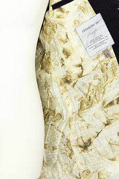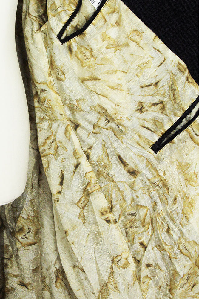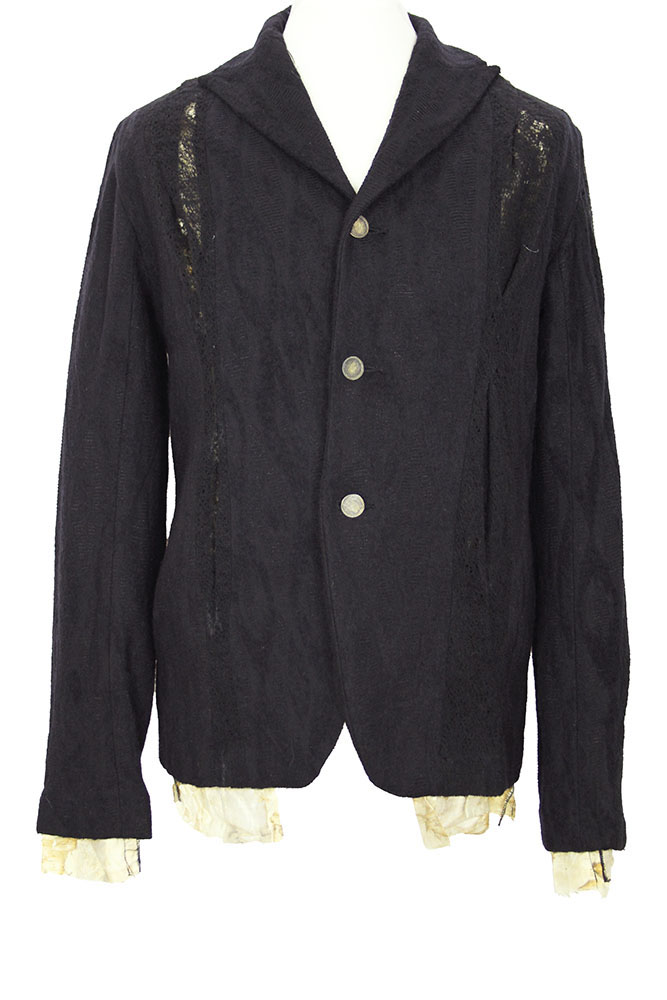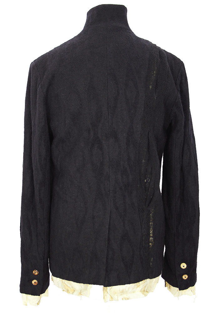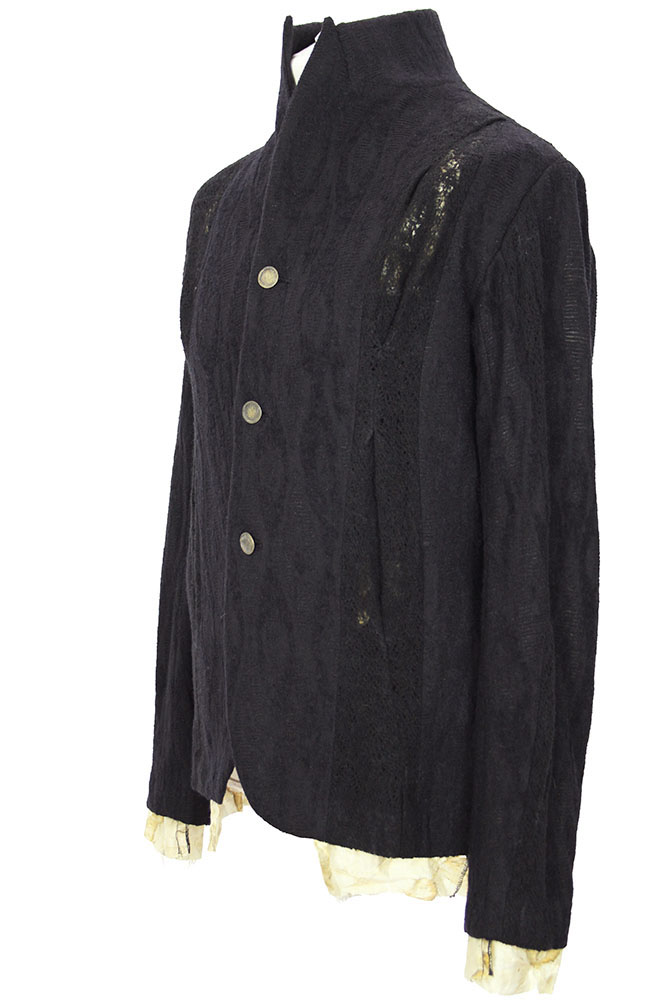 Chiahung Su mixed cotton and wool, 3 buttoned, panelled jacket in black. The panels are all textured and patterned with alternate black patterned lace. Collar with sewn notched lapels. 3 button fastening, buttons are hand made from old Taiwanese coins. All buttons have small metal reinforcing buttons inside. 2 pockets in side seams. 2 button working cuffs with extending raw edged lining. Single central vent at rear. Fully lined in Japanese woven patterned silk. The lining extends below the hem of the main jacket. Single inside pocket. A wonderful jacket in a beautifully soft and interestingly stylish fabric.