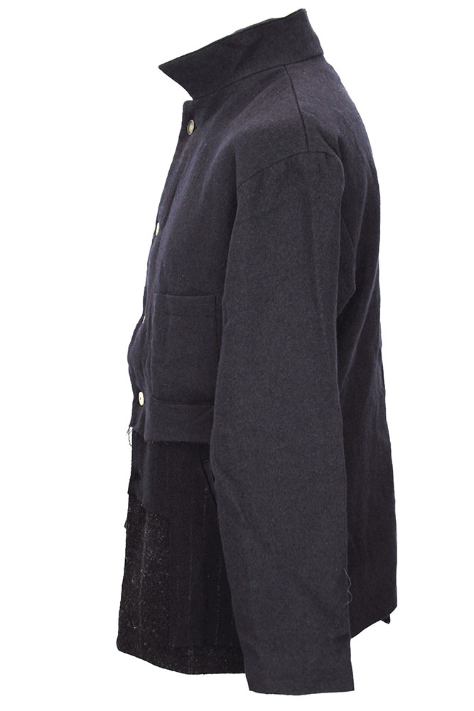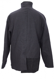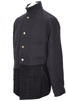Chiahung Su Long 5 buttoned jacket in 3 different wool fabrics. Round neck with raised collar, or it can be worn with the collar down and with notched lapels. The upper, outer layers in a plain black wool, with an under layer od pinstriped wool, followed by another layer of coarser dark black pinstriped wool. The layers are throughout the jacket making the garment 4 layers including the lining, so a warm piece. Left chest pocket. 2 angled pockets with trim. Raw edged detail where laters end, but with fully finished hems. The sleeves are single layered with lining and plain turned cuffs. Central vent at rear. The hem is at different lengths. Fully lined inside in woven patterned Japanese silk. The layering of this piece makes it quite substantial. A very special garment.