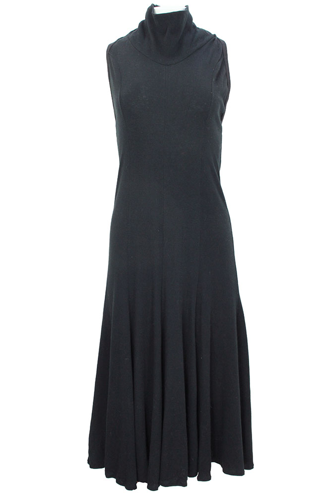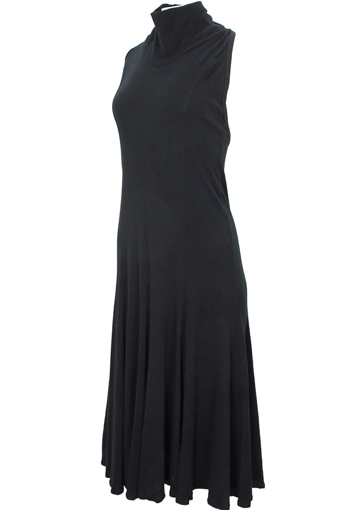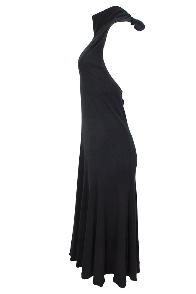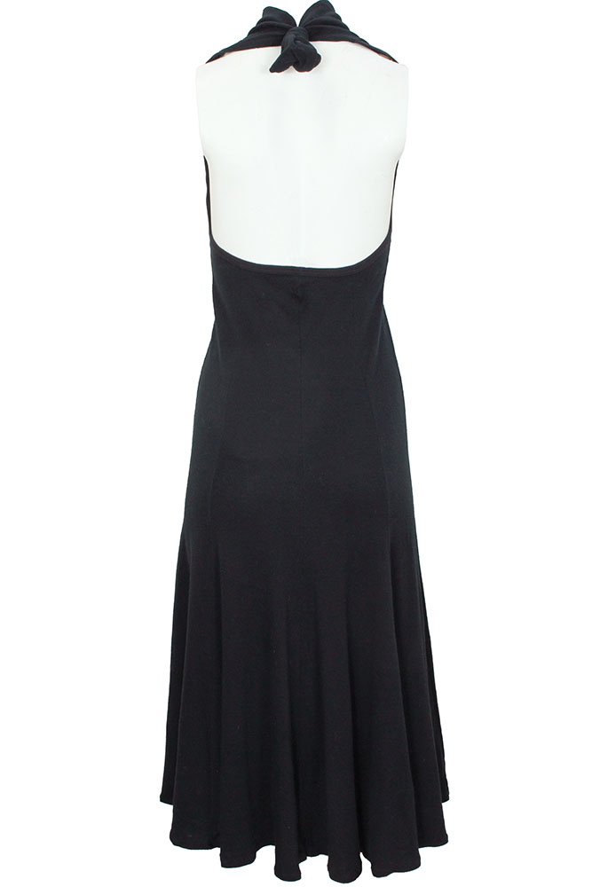 BodyMap black, backless, full length dress in 100% soft, stretch, cotton jersey. Round, double layered neck with tie at rear. Fitted on body, with a generous and full skirt section, which hangs beautifully. The dress is backless and tied behind the neck. Ribbed trim around all the edges. A beautiful dress in a wonderful, soft, stretch cotton. Stunning fitted with elegant, skirt and a very fine example of this very important designer. Unworn and with BodyMap label, fabric label and washing instructions. Made in Great Britain. Purchased by Corniche in mid 1980s in London and stored safely ever since. The garment is in excellent condition. Sized small.